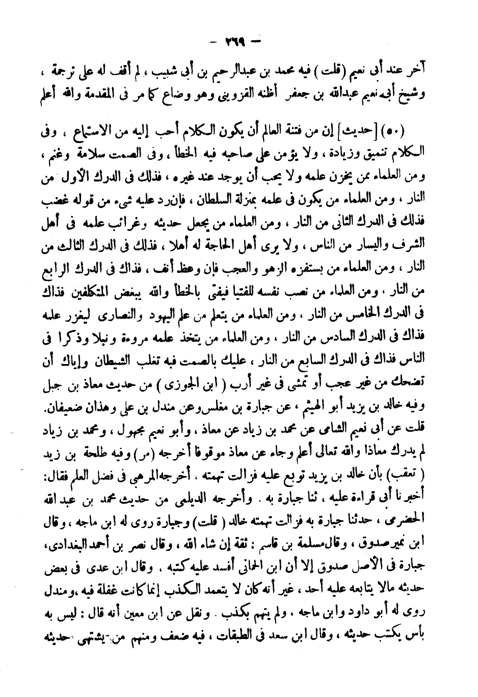 (50) [حَدِيثٌ] " إِنَّ مِنْ فِتْنَةِ الْعَالِمِ أَنْ يَكُونَ الْكَلامُ أَحَبَّ إِلَيْهِ مِنَ الاسْتِمَاعِ، وَفِي الْكَلامِ تَنْمِيقٌ وَزِيَادَةٌ، وَلا يُؤْمَنُ عَلَى صَاحِبِه فِيهِ الْخَطَأُ، وَفِي الصَّمْتِ سَلامَةٌ وغنم، وَمن الْعلمَاء مِمَّن يَخْزِنُ عِلْمَهُ وَلا يُحِبُّ أَنْ يُوجَدَ عِنْدَ غَيْرِهِ، فَذَلِكَ فِي الدَّرْكِ الأَوَّلِ مِنَ النَّارِ، وَمِنَ الْعُلَمَاءِ مَنْ يَكُونُ فِي عِلْمِهِ بِمَنْزِلَةِ السُّلْطَانِ، فَإِنْ رُدَّ عَلَيْهِ شئ مِنْ قَوْلِهِ غَضِبَ فَذَلِكَ فِي الدَّرْكِ الثَّانِي مِنَ النَّارِ، وَمِنَ الْعُلَمَاءِ مَنْ يَجْعَلُ حَدِيثَهُ، وَغَرَائِبَ عِلْمِهِ فِي أَهْلِ الشَّرَفِ وَالْيَسَارِ مِنَ النَّاسِ، وَلا يَرَى أَهْلَ الْحَاجَةِ لَهُ أَهْلا، فَذَلِكَ فِي الدَّرْكِ الثَّالِثِ مِنَ النَّارِ، وَمِنَ الْعُلَمَاءِ مَنْ يَسْتَفِزُّهُ الزَّهْوُ وَالْعُجْبُ فَإِنْ وُعِظَ أَنِفَ، فَذَاكَ فِي الدَّرْكِ الرَّابِعِ مِنَ النَّارِ، وَمِنَ الْعُلَمَاءِ مَنْ نَصَّبَ نَفْسَهُ لِلْفُتْيَا فَيُفْتِي بِالْخَطَإِ وَاللَّهُ يَبْغَضُ الْمُتَكَلِّفِينَ فَذَاكَ فِي الدَّرْكِ الْخَامِسِ مِنَ النَّارِ، وَمِنَ الْعُلَمَاءِ مَنْ يَتَعَلَّمُ مِنْ عِلْمِ الْيَهُودِ وَالنَّصَارَى لِيُغَزِّرَ عِلْمَهُ فَذَاكَ فِي الدَّرْكِ السَّادِسِ مِنَ النَّارِ، وَمِنَ الْعُلَمَاءِ مَنْ يَتَّخِذُ عِلْمَهُ مُرُوءَةً وَنُبْلا وَذِكْرًا فِي النَّاسِ فَذَاكَ فِي الدَّرْكِ السَّابِعِ مِنَ النَّارِ، عَلَيْكَ بِالصَّمْتِ فَبِهِ تَغْلِبُ الشَّيْطَانَ وَإِيَّاكَ أَنْ تَضْحَكَ مِنْ غَيْرِ عَجَبٍ أَوْ تَمْشِي فِي غَيْرِ أَرَبٍ " (ابْن الْجَوْزِيّ) من حَدِيث معَاذ بن جبل وَفِيه خَالِد بن يزِيد أَبُو الْهَيْثَم، عَن جبارَة بن مغلس وَعَن منْدَل بن عَليّ وَهَذَانِ ضعيفان. قلت عَن أبي نعيم الشَّامي عَن مُحَمَّد بن زِيَاد عَن معَاذ، وَأَبُو نعيم مَجْهُول، وَمُحَمّد بن زِيَاد لم يدْرك معَاذًا وَالله تَعَالَى أعلم وَجَاء عَن معَاذ مَوْقُوفا أخرجه (مر) وَفِيه طَلْحَة بن زيد (تعقب) بِأَن خَالِد بن يزِيد توبع عَلَيْهِ فَزَالَتْ تهمته، أخرجه المرهبي فِي فضل الْعلم فَقَالَ: أخبرنَا أبي قِرَاءَة عَلَيْهِ، ثَنَا جبارَة بِهِ. وَأخرجه الديلمي من حَدِيث مُحَمَّد بن عبد الله الْحَضْرَمِيّ، حَدثنَا جبارَة بِهِ فَزَالَتْ تهمته خَالِد (قلت) وجبارة روى لَهُ ابْن مَاجَه، وَقَالَ ابْن نمير صَدُوق، وَقَالَ مسلمة بن قَاسم: ثِقَة إِن شَاءَ الله، وَقَالَ نصر بن أَحْمد الْبَغْدَادِيّ، جبارَة فِي الأَصْل صَدُوق إِلَّا أَن ابْن الْحمانِي أفسد عَلَيْهِ كتبه، وَقَالَ ابْن عدي فِي بعض حَدِيثه مَالا يُتَابِعه عَلَيْهِ أحد، غير أَنه كَانَ لَا يتَعَمَّد الْكَذِب إِنَّمَا كَانَت غَفلَة فِيهِ، ومندل روى لَهُ أَبُو دَاوُدَ وَابْنُ مَاجَهْ، وَلم يتهم بكذب. وَنقل عَن ابْن معِين أَنه قَالَ: " لَيْسَ بِهِ بَأْس يكْتب حَدِيثه، " وَقَالَ ابْن سعد فِي الطَّبَقَات، فِيهِ ضعف وَمِنْهُم من يَشْتَهِي حَدِيثا