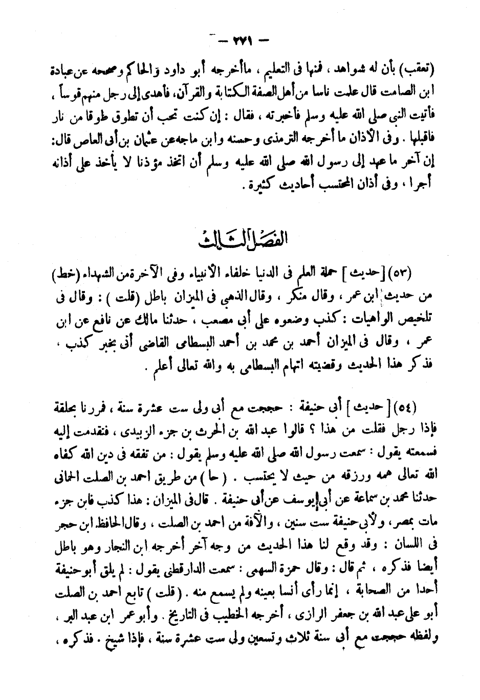 (54) [حَدِيثُ] " أَبِي حَنِيفَةَ: حَجَجْتُ مَعَ أَبِي وَلِي سِتَّ عَشْرَةَ سَنَةً، فَمَرَرْنَا بِحَلَقَةٍ فَإِذَا رَجُلٌ فَقُلْتُ مَنْ هَذَا؟ قَالُوا عبد الله بن الْحَرْث بْنِ جُزْءٍ الزُّبَيْدِيُّ، فَتَقَدَّمْتُ إِلَيْهِ فَسَمِعْتُهُ يَقُولُ: سَمِعْتُ رَسُولَ اللَّهِ يَقُولُ: مَنْ تَفَقَّهَ مِنْ دِينِ اللَّهِ كَفَاهُ اللَّهُ تَعَالَى هَمَّهُ وَرَزَقَهُ مِنْ حَيْثُ لَا يَحْتَسِبُ ". (حا) من طَرِيق أَحْمد بن الصَّلْت الْحمانِي حَدثنَا مُحَمَّد بن سَمَّاعَة عَن أبي يُوسُف عَن أبي حنيفَة. قَالَ فِي الْمِيزَان: هَذَا كذب فَابْن جُزْء مَاتَ بِمصْر، وَلأبي حنيفَة سِتّ سِنِين، والآفة من أَحْمد بن الصَّلْت، وَقَالَ الْحَافِظ ابْن حجر فِي اللِّسَان: وَقد وَقع لنا هَذَا الحَدِيث من وَجه آخر أخرجه ابْن النجار وَهُوَ بَاطِل أَيْضا فَذكره، ثمَّ قَالَ: وَقَالَ حَمْزَة السَّهْمِي: سَمِعت الدَّارَقُطْنِيّ يَقُول: لم يلق أَبُو حنيفَة أحدا من الصَّحَابَة، إِنَّمَا رأى أنسا بِعَيْنِه وَلم يسمع مِنْهُ. (قلت) تَابع أَحْمد بن الصَّلْت أَبُو عَليّ عبد الله بن جَعْفَر الرَّازِيّ، أخرجه الْخَطِيب فِي التَّارِيخ، وَأَبُو عمر ابْن عبد الْبر، وَلَفظه " حججْت مَعَ أبي سنة ثَلَاث وَتِسْعين ولي سِتّ عشرَة سنة، " فَإِذا شيخ، فَذكره،