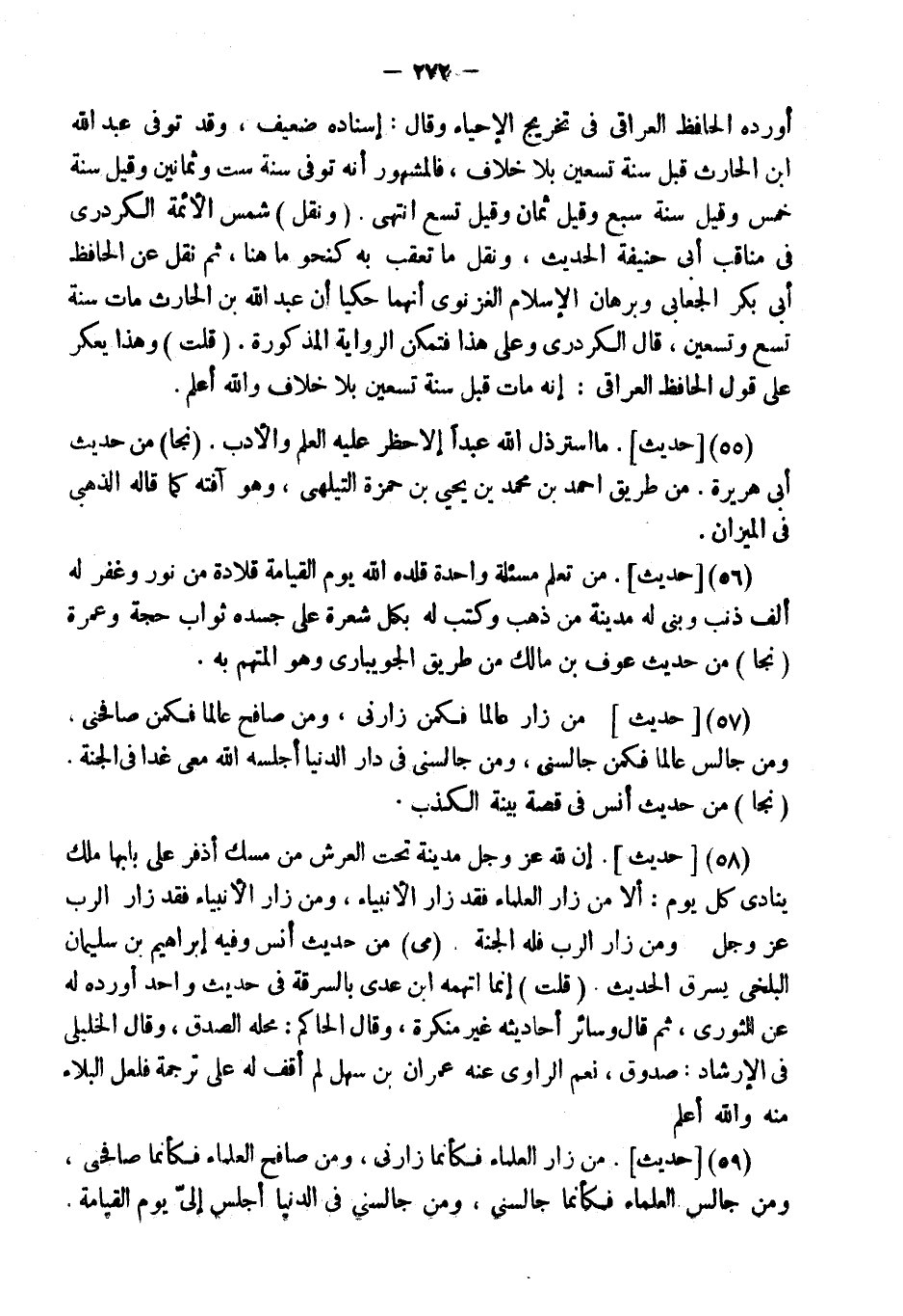 (59) [حَدِيثٌ] . " مَنْ زَارَ الْعُلَمَاءَ فَكَأَنَّمَا زَارَنِي، وَمَنْ صَافَحَ الْعُلَمَاءَ فَكَأَنَّمَا صَافَحَنِي، وَمَنْ جَالَسَ الْعُلَمَاءَ فَكَأَنَّمَا جَالَسَنِي، وَمَنْ جَالَسَنِي فِي الدُّنْيَا أُجْلِسَ إِلَيَّ يَوْمَ الْقِيَامَةِ ".