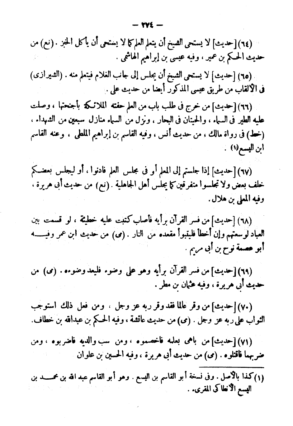 (66) [حَدِيثٌ] " مَنْ خَرَجَ فِي طَلَبِ بَابٍ مِنَ الْعِلْمِ حَفَّتْهُ الْمَلائِكَةُ بِأَجْنِحَتِهَا، وَصَلَّتْ عَلَيْهِ الطَّيْرُ فِي السَّمَاءِ، وَالْحِيتَانُ فِي الْبِحَارِ، وَنَزَلَ مِنَ السَّمَاءِ مَنَازِلَ سَبْعِينَ مِنَ الشُّهَدَاءِ، " (خطّ) فِي رُوَاة مَالك، من حَدِيث أنس، وَفِيه الْقَاسِم بن إِبْرَاهِيم الْمَلْطِي، وَعنهُ الْقَاسِم ابْن اليسع.