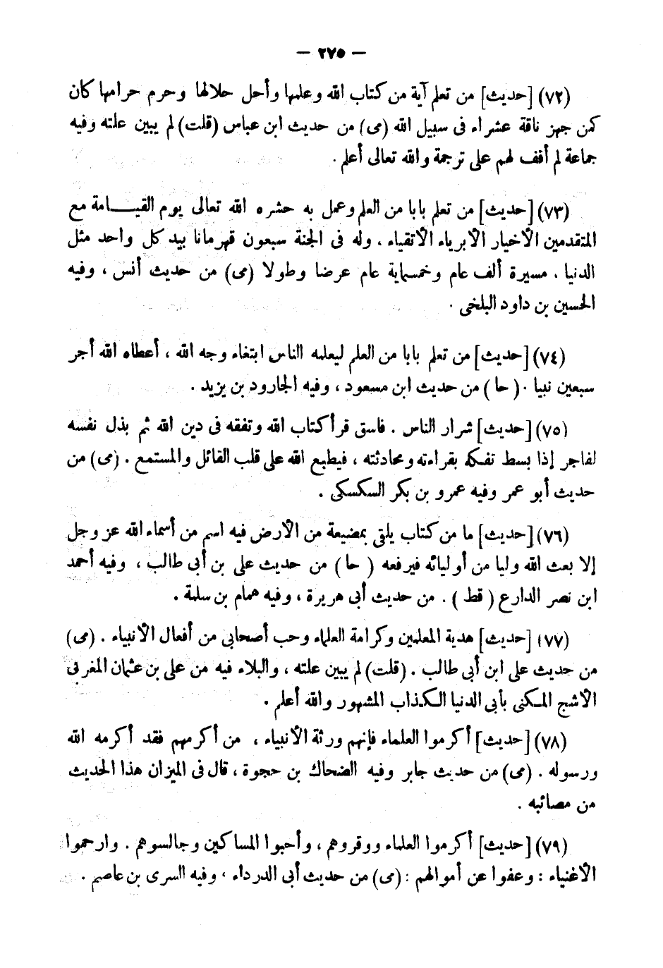 (73) [حَدِيثٌ] " مَنْ تَعَلَّمَ بَابًا مِنَ الْعِلْمِ وَعَمِلَ بِهِ حَشَرَهُ اللَّهُ تَعَالَى يَوْمَ الْقِيَامَةِ مَعَ الْمُتَقَدِّمِينَ الأَخْيَارِ الأَبْرِيَاءِ الأَتْقِيَاءِ، وَلَهُ فِي الْجَنَّةِ سَبْعُونَ قَهْرَمَانًا بِيَدِ كُلِّ وَاحِدٍ مِثْلُ الدُّنْيَا، مسيرَة ألف عَام وخمسماية عَامٍ عَرْضًا وَطُولا " (مي) من حَدِيث أنس، وَفِيه الْحُسَيْن بن دَاوُد الْبَلْخِي.