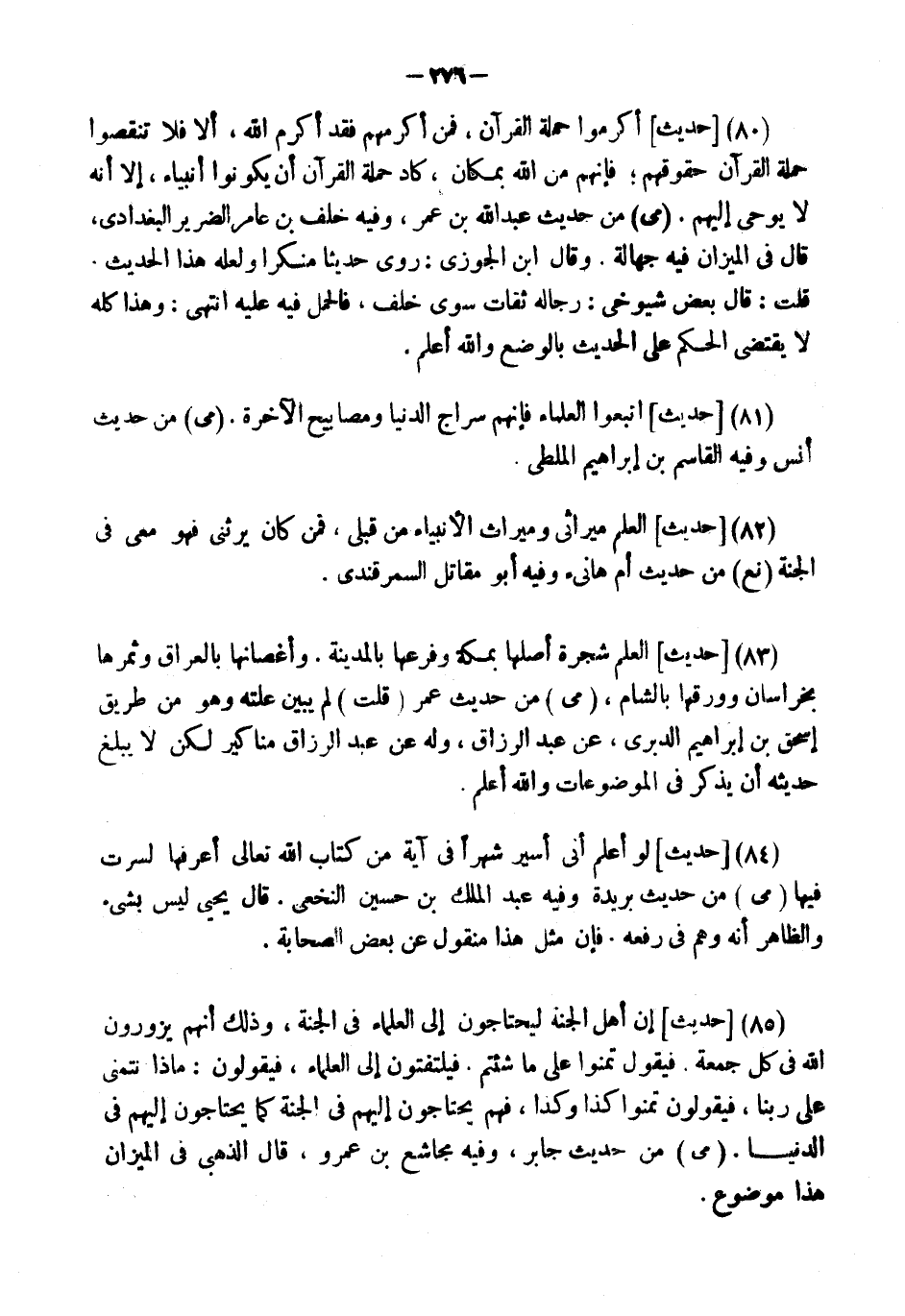 (85) [حَدِيثٌ] " إِنَّ أَهْلَ الْجَنَّةِ لَيَحْتَاجُونَ إِلَى الْعُلَمَاءِ فِي الْجَنَّةِ، وَذَلِكَ أَنَّهُمْ يَزُورُونَ اللَّهَ فِي كُلِّ جُمُعَةٍ. فَيَقُولُ تَمَنَّوْا عَلَيَّ مَا شِئْتُمْ. فَيَلْتَفِتُونَ إِلَى الْعُلَمَاءِ، فَيَقُولُونَ: مَاذَا نَتَمَنَّى عَلَى رَبِّنَا، فَيَقُولُونَ تَمَنَّوْا كَذَا وَكَذَا، فَهُمْ يَحْتَاجُونَ إِلَيْهِمْ فِي الْجَنَّةِ كَمَا يَحْتَاجُونَ إِلَيْهِمْ فِي الدُّنْيَا ". (مي) من حَدِيث جَابر، وَفِيه مجاشع بن عَمْرو، قَالَ الذَّهَبِيّ فى الْمِيزَان هَذَا مَوْضُوع.