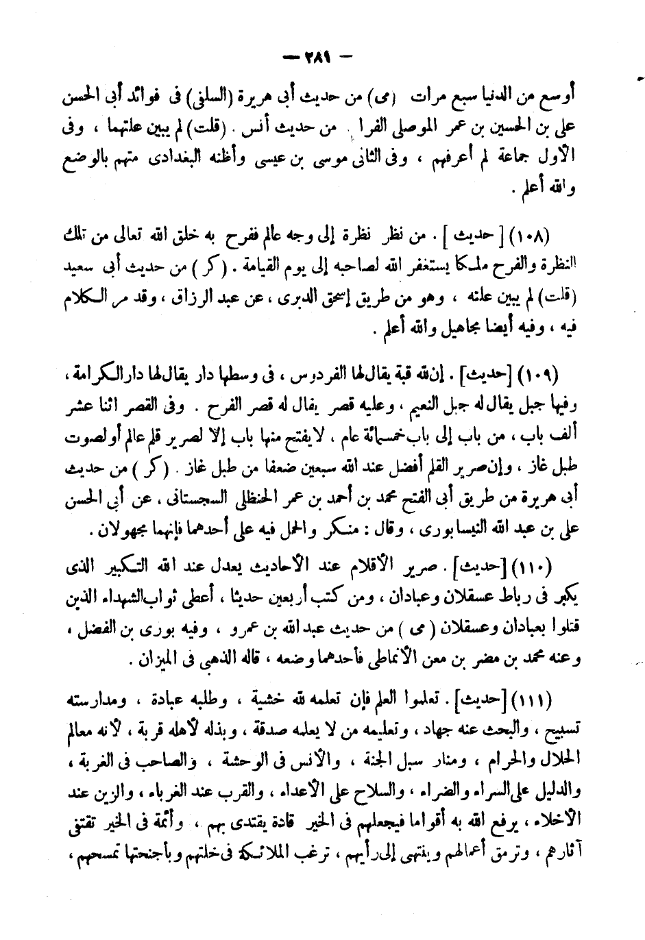 (109) [حَدِيثٌ] . " إِنَّ لِلَّهِ قُبَّةً يُقَالُ لَهَا الْفِرْدَوْسُ، فِي وَسَطِهَا دَارٌ يُقَالُ لَهَا دَارُ الْكَرَامَةِ، وَفِيهَا جَبَلٌ يُقَالُ لَهُ جَبَلُ النَّعِيمِ، وَعَلَيْهِ قَصْرٌ يُقَالُ لَهُ قَصْرُ الْفَرَحِ. وَفِي الْقَصْرِ اثْنَا عَشَرَ أَلْفِ بَابٍ، من بَاب إِلَى بَاب خَمْسمِائَة عَامٍ، لَا يُفْتَحُ مِنْهَا بَابٌ إِلا لِصَرِيرِ قَلَمِ عَالِمٍ أَوْ لِصَوْتِ طَبْلٍ غَازٍ، وَإِنَّ صَرِيرَ الْقَلَمِ أَفْضَلُ عِنْدَ اللَّهِ سَبْعِينَ ضِعْفًا مِنْ طَبْلٍ غَازٍ " (كرّ) مِنْ حَدِيثِ أَبِي هُرَيْرَةَ مِنْ طَرِيق أبي الْفَتْح مُحَمَّد بن أَحْمد بن عمر الْحَنْظَلِي السجسْتانِي، عَن أبي الْحسن عَليّ بن عبد الله النَّيْسَابُورِي، وَقَالَ: مُنكر وَالْحمل فِيهِ على أَحدهمَا فَإِنَّهُمَا مَجْهُولَانِ.