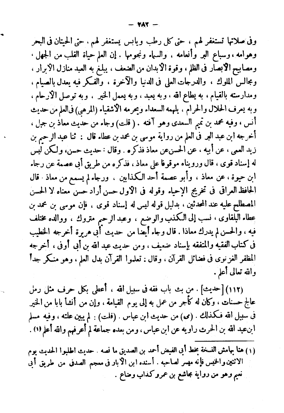 وَفِي صَلاتِهَا تَسْتَغْفِرُ لَهُمْ، حَتَّى كُلُّ رَطْبٍ وَيَابِسٍ يَسْتَغْفِرُ لَهُمْ، حَتَّى الْحِيتَانُ فِي الْبَحْرِ وَهَوَامَّهُ، وَسِبَاعَ الْبَرِّ وَأَنْعَامَهُ، وَالسَّمَاءَ وَنُجُومَهَا، إِنَّ الْعِلْمَ حَيَاةُ الْقَلْبِ مِنَ الْجَهْلِ، وَمَصَابِيحُ الأَبْصَارِ فِي الظُّلَمِ، وَقُوَّةُ الأَبْدَانِ مِنَ الضَّعْفِ، يَبْلُغُ بِهِ الْعَبْدُ مَنَازِلَ الأَبْرَارِ، وَمَجَالِسُ الْمُلُوكِ، وَالدَّرَجَاتُ الْعُلَى فِي الدُّنْيَا وَالآخِرَةِ، وَالْفِكْرُ فِيهِ يُعْدَلُ بِالصِّيَامِ، وَمُدَارَسَتُهُ بِالْقِيَامِ، بِهِ يُطَاعُ اللَّهُ، وَبِهِ يُعْبَدُ، وَبِهِ يُعْمَلُ الْخَيْرُ، وَبِهِ تُوصَلُ الأَرْحَامُ، وَبِهِ يُعْرَفُ الْحَلالُ وَالْحَرَامُ، يُلْهَمُهُ السُّعَدَاءُ وَيُحْرَمُهُ الأَشْقِيَاءُ " (المرهبي) فِي الْعلم من حَدِيثِ أَنَسٍ، وَفِيهِ مُحَمَّدُ بْنُ تَمِيم السَّعْدِيّ وَهُوَ آفته. (قلت) وَجَاء من حَدِيث معَاذ بن جبل، أخرجه ابْن عبد الْبر فِي الْعلم من رِوَايَة مُوسَى بن مُحَمَّد بن عَطاء قَالَ: ثَنَا عبد الرَّحِيم بن زيد الْعمي، عَن أَبِيه، عَن الْحسن عَن معَاذ فَذكره. وَقَالَ: حَدِيث حسن، وَلَكِن لَيْسَ لَهُ إِسْنَاد قوي، قَالَ ورويناه مَوْقُوفا على معَاذ، فَذكره من طَرِيق أبي عصمَة عَن رَجَاء ابْن حَيْوَة، عَن معَاذ، وَأَبُو عصمَة أحد الْكَذَّابين، ورجاء لم يسمع من معَاذ، قَالَ الْحَافِظ الْعِرَاقِيّ فِي تَخْرِيج الْإِحْيَاء وَقَوله فِي الأول حسن أَرَادَ حسن مَعْنَاهُ لَا الْحسن المصطلح عَلَيْهِ عِنْد الْمُحدثين، بِدَلِيل قَوْله لَيْسَ لَهُ إِسْنَاد قوي، فَإِن مُوسَى بن مُحَمَّد بن عَطاء الْبُلْقَاوِيُّ، نسب إِلَى الْكَذِب والوضع، وَعبد الرَّحِيم مَتْرُوك، ووالده مُخْتَلف فِيهِ، وَالْحسن لم يدْرك معَاذًا. قَالَ وَجَاء أَيْضا من حَدِيث أبي هُرَيْرَة أخرجه الْخَطِيب فِي كتاب الْفَقِيه والمتفقه بِإِسْنَاد ضَعِيف، وَمن حَدِيث عَبْدِ اللَّهِ بْنِ أَبِي أَوْفَى، أخرجه المظفر الغزنوي فِي فَضَائِل الْقُرْآن، وَقَالَ: " تعلمُوا الْقُرْآن بدل الْعلم، " وَهُوَ مُنكر جدا وَالله تَعَالَى أعلم.