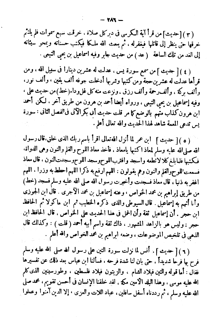 (5) [حَدِيثُ] " ابْنِ عُمَرَ لَمَّا أَنْزَلَ اللَّهُ تَعَالَى اقْرَأْ بِاسْمِ رَبِّكَ الَّذِي خلق، قَالَ رَسُول الله لِمُعَاذٍ اكْتُبْهَا يَا مُعَاذُ، فَأَخَذَ مُعَاذٌ اللَّوْحَ وَالْقَلَمَ وَالنُّونَ وَهِيَ الدَّوَاةُ، فَكَتَبَهَا فَلَمَّا بَلَغَ {كَلا لَا تطعه واسجد واقترب} اللَّوْح وَسجد اللَّوْح وَسَجَدَتِ النُّونُ، قَالَ مُعَاذٌ فَسَمِعْتُ اللَّوْحَ وَالْقَلَمَ وَالنُّونَ وَهُمْ يَقُولُونَ: اللَّهُمَّ ارْفَعْ بِهِ ذِكْرًا اللَّهُمَّ احْطُطْ بِهِ وِزْرًا، اللَّهُمَّ اغْفِرْ بِهِ ذَنْبًا، قَالَ مُعَاذٌ فَسَجَدْتُ وأخبرت رَسُول الله فَسَجَدَ " (خطّ) من طَرِيق إِبْرَاهِيم بن مُحَمَّد الْخَواص، وَعنهُ إِسْمَاعِيل بن مُحَمَّد الْآجُرِيّ. قَالَ ابْن الْجَوْزِيّ وَأَنا أتهم بِهِ إِسْمَاعِيل. قَالَ السُّيُوطِيّ وَالَّذِي ذكره الْخَطِيب ثمَّ ابْن مَاكُولَا ثمَّ الْحَافِظ ابْن حجر. أَن إِسْمَاعِيل ثِقَة وَأَن الْحمل فِي هَذَا الحَدِيث على الْخَواص، قَالَ الْحَافِظ ابْن حجر: وَلَيْسَ هُوَ بالزاهد الْمَشْهُور، ذَاك ثِقَة وَاسم أَبِيه أَحْمد (قلت) : وَكَذَلِكَ قَالَ الذَّهَبِيّ فِي تَلْخِيص الموضوعات، وَضعه إِبْرَاهِيم بن مُحَمَّد الْخَواص وَالله أعلم.