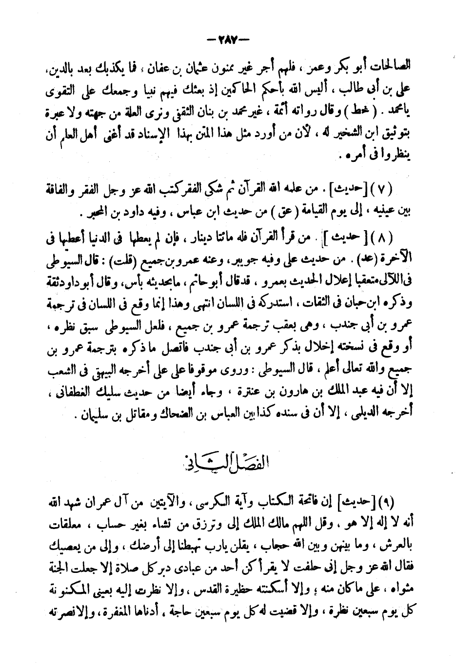 (9) [حَدِيثٌ] " إِنَّ فَاتِحَةَ الْكِتَابِ وَآيَةَ الْكُرْسِيِّ، وَالآيَتَيْنِ مِنْ آلِ عِمْرَانَ ( {شَهِدَ اللَّهُ أَنَّهُ لَا إِلَه إِلَّا هُوَ} وَقل اللَّهُمَّ مَالِكَ الْمُلْكِ) إِلَى {وَتَرْزُقُ من تشَاء بِغَيْر حِسَاب} ، مُعَلَّقَاتٌ بِالْعَرْشِ، وَمَا بَيْنَهُنَّ وَبَيْنَ اللَّهِ حِجَابٌ، يَقُلْنُ يَا رَبِّ تُهْبِطُنَا إِلَى أَرْضِكَ، وَإِلَى مَنْ يَعْصِيكَ فَقَالَ اللَّهُ عَزَّ وَجَلَّ إنى حَلَفت لَا يقْرَأ كن أَحَدٌ مِنْ عِبَادِي دُبُرَ كُلِّ صَلاةٍ إِلا جَعَلْتُ الْجَنَّةَ مَثْوَاهُ، عَلَى مَا كَانَ مِنْهُ؛ وَإِلا أسكتته حَظِيرَةَ الْقُدْسِ، وَإِلا نَظَرْتُ إِلَيْهِ بِعَيْنِي الْمَكْنُونَةِ كُلَّ يَوْمٍ سَبْعِينَ نَظْرَةً، وَإِلا قَضَيْتُ لَهُ كُلَّ يَوْمٍ سَبْعِينَ حَاجَةً، أَدْنَاهَا الْمَغْفِرَةُ، وَإِلَّا نصرته