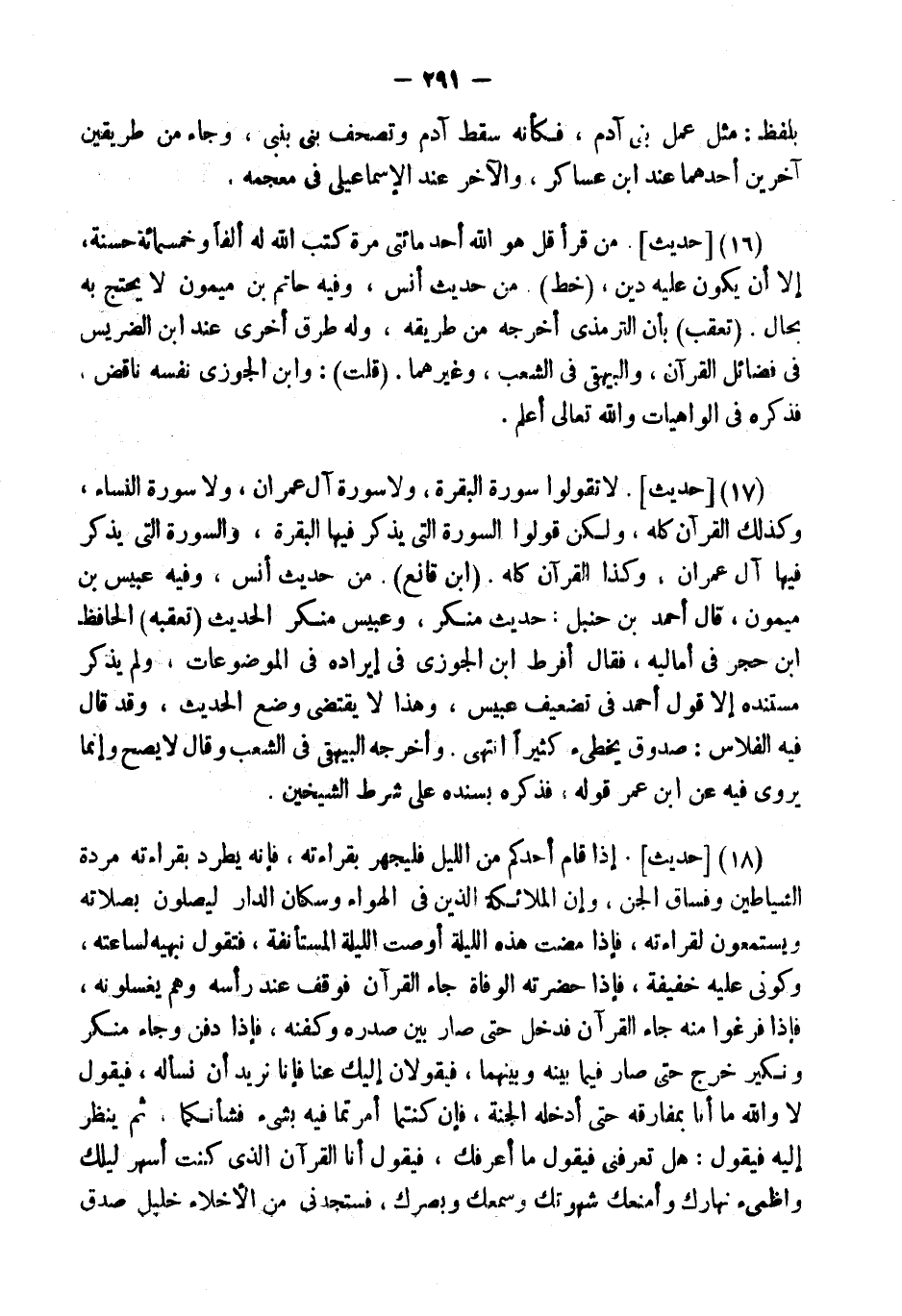 (18) [حَدِيثٌ] . " إِذَا قَامَ أَحَدُكُمْ مِنَ اللَّيْلِ فَلْيَجْهَرْ بِقِرَاءَتِهِ، فَإِنَّهُ يَطْرُدُ بِقِرَاءَتِهِ مَرَدَةَ الشَّيَاطِينِ وَفُسَّاقَ الْجِنِّ، وَإِنَّ الْمَلائِكَةَ الَّذِينَ فِي الْهَوَاءِ وَسُكَّانَ الدَّارِ لَيُصَلُّونَ بِصَلاتِهِ وَيَسْتَمِعُونَ لِقِرَاءَتِهِ، فَإِذَا مَضَتْ هَذِهِ اللَّيْلَةُ أَوْصَتِ اللَّيْلَةَ الْمُسْتَأْنَفَةَ، فَتَقُولُ نَبِّهِيهِ لِسَاعَتِهِ، وَكُونِي عَلَيْهِ خَفِيفَةً، فَإِذَا حَضَرَتْهُ الْوَفَاةُ جَاءَ الْقُرْآنُ فَوَقَفَ عِنْدَ رَأْسِهِ وَهُمْ يُغَسِّلُونَهُ، فَإِذَا فَرَغُوا مِنْهُ جَاءَ الْقُرْآنُ فَدَخَلَ حَتَّى صَارَ بَيْنَ صَدْرِهِ وَكَفَنِهِ، فَإِذَا دُفِنَ وَجَاءَ مُنْكَرٌ وَنَكِيرٌ خَرَجَ حَتَّى صَارَ فِيمَا بَيْنَهُ وَبَيْنَهُمَا، فَيَقُولانِ إِلَيْكَ عَنَّا فَإِنَّا نُرِيدُ أَنْ نَسْأَلَهُ، فَيَقُولُ لَا وَاللَّهِ مَا أَنَا بِمُفَارِقِهِ حَتَّى أُدْخِلَهُ الْجَنَّةَ، فَإِنْ كنتما أمرتما فِيهِ بشئ فَشَأْنَكُمَا. ثُمَّ يَنْظُرُ إِلَيْهِ فَيَقُولُ: هَلْ تَعْرِفُنِي فَيَقُولُ مَا أَعْرِفُكَ، فَيَقُولُ أَنَا الْقُرْآنُ الَّذِي كُنْتُ أُسْهِرُ لَيْلَكَ وَأُظْمِئُ نَهَارَكَ وَأَمْنَعُكَ شَهْوَتَكَ وَسَمْعَكَ وَبَصَرَكَ، فَسَتَجِدُنِي مِنَ الأخلاء خَلِيل صدق