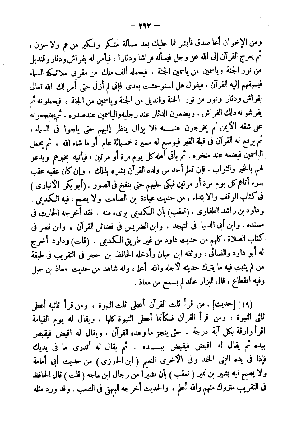 وَمِنَ الإِخْوَانِ أَخَا صِدْقٍ فَأَبْشِرْ فَمَا عَلَيْكَ بَعْدَ مَسْأَلَةِ مُنْكَرٍ وَنَكِيرٍ مِنْ هَمٍّ وَلا حَزَنٍ، ثُمَّ يَعْرُجُ الْقُرْآنُ إِلَى اللَّهِ عَزَّ وَجَلَّ فَيَسْأَلُهُ فِرَاشًا وَدِثَارًا، فَيَأْمُرُ لَهُ بِفِرَاشٍ وَدِثَارٍ وَقِنْدِيلٍ مِنْ نُورِ الْجَنَّةِ وَيَاسَمِينَ مِنْ ياسمين الْجنَّة، فيحمله أَله مَلَكٍ مِنْ مُقَرَّبِي مَلائِكَةِ السَّمَاءِ فَيَسْبِقُهُمْ إِلَيْهِ الْقُرْآنُ، فَيَقُولُ هَلِ اسْتَوْحَشْتَ بَعْدِي فَإِنِّي لَمْ أَزَلْ حَتَّى أَمَرَ لَكَ اللَّهُ تَعَالَى بِفِرَاشٍ وَدِثَارٍ وَنُورٍ مِنْ نُورِ الْجَنَّةِ وَقِنْدِيلٍ مِنَ الْجَنَّةِ وَيَاسمِيَن مِنَ الْجَنَّةِ، فَيَحْمِلُونَهُ ثُمَّ يَفْرِشُونَهُ ذَلِكَ الْفِرَاشَ، وَيَضَعُونَ الدِّثَارَ عِنْدَ رِجْلَيْهِ وَالْيَاسَمِينَ عِنْدَ صَدْرِهِ، ثُمَّ يُضْجِعُونَهُ عَلَى شِقِّهِ الأَيْمَنِ ثُمَّ يَخْرُجُونَ عَنْهُ فَلا يَزَالُ يَنْظُرُ إِلَيْهِمْ حَتَّى يَلِجُوا فِي السَّمَاءِ، ثُمَّ يُرْفَعُ لَهُ الْقُرْآنُ فِي قِبْلَةِ الْقَبْرِ فَيُوسَعُ لَهُ مَسِيرَةَ خَمْسمِائَة عَامٍ أَوْ مَا شَاءَ اللَّهُ، ثُمَّ يُحْمَلُ الْيَاسَمِينُ فَيَضَعُهُ عِنْدَ مِنْخَرِهِ، ثُمَّ يَأْتِي أَهْلَهُ كُلَّ يَوْمٍ مَرَّةً أَوْ مَرَّتَيْنِ، فَيَأْتِيهِ بِخَبَرِهِمْ وَيَدْعُو لَهُمْ بِالْخَيْرِ وَالثَّوَابِ، فَإِنْ تَعَلَّمَ أَحَدٌ مِنْ وَلَدِهِ الْقُرْآنَ بَشَّرَهُ بِذَلِكَ، وَإِنْ كَانَ عَقِبُهُ عَقِبَ سُوءٍ أَتَاهُمْ كُلَّ يَوْمٍ مَرَّةً أَوْ مَرَّتَيْنِ فَبَكَى عَلَيْهِمْ حَتَّى يُنْفَخَ فِي الصُّورِ ". (أَبُو بكر الْأَنْبَارِي) فِي كتاب الْوَقْف والابتداء، من حَدِيث عبَادَة بن الصَّامِت وَلَا يَصح، فِيهِ الْكُدَيْمِي. وَدَاوُد بن رَاشد الطفَاوِي. (تعقب) بِأَن الْكُدَيْمِي برِئ مِنْهُ. فقد أخرجه الْحَارِث فِي مُسْنده، وَابْن أبي الدُّنْيَا فِي التَّهَجُّد، وَابْن الضريس فِي فَضَائِل الْقُرْآن، وَابْن نصر فِي كتاب الصَّلَاة، كلهم من حَدِيث دَاوُد من غير طَرِيق الْكُدَيْمِي. (قلت) وَدَاوُد أخرج لَهُ أَبُو دَاوُد وَالنَّسَائِيّ، وَوَثَّقَهُ ابْن حبَان وَأدْخلهُ الْحَافِظ بن حجر فِي التَّقْرِيب فِي طبقَة من لم يثبت فِيهِ مَا يتْرك حَدِيث لأَجله وَالله أعلم، وَله شَاهد من حَدِيث معَاذ بن جبل وَفِيه انْقِطَاع، قَالَ الْبَزَّار خَالِد لم يسمع من معَاذ.