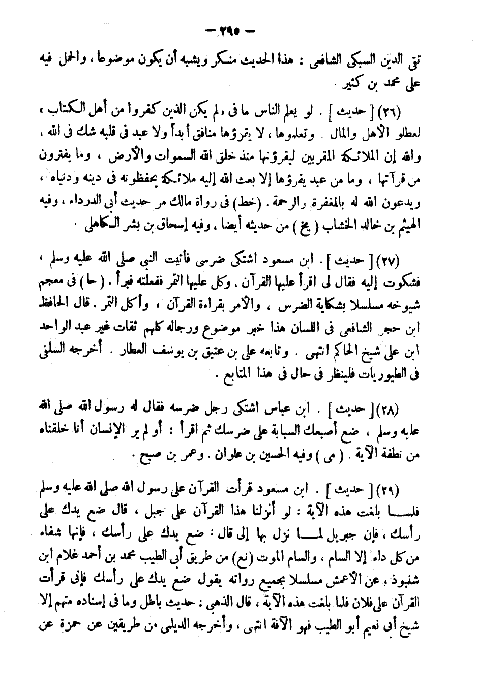 (29) [حَدِيثُ] . " ابْنِ مَسْعُودٍ قَرَأْتُ الْقُرْآنَ عَلَى رَسُول الله فَلَمَّا بَلَغْتُ هَذِهِ الآيَةَ: {لَوْ أَنْزَلْنَا هَذَا الْقُرْآنَ عَلَى جَبَلٍ} ، قَالَ ضَعْ يَدَكَ عَلَى رَأْسِكَ، فَإِنَّ جِبْرِيلَ لَمَّا نَزَلَ بِهَا إِلَيَّ قَالَ: ضَعْ يَدَكَ عَلَى رَأْسِكَ،، فَإِنَّهَا شِفَاءٌ مِنْ كُلِّ دَاءٍ إِلا السَّامُ، والسام الْمَوْت " (نع) من طَرِيق أبي الطّيب مُحَمَّد بن أَحْمد غُلَام ابْن شنبوذ، عَن الْأَعْمَش مسلسلا بِجَمِيعِ رُوَاته يَقُول " ضع يدك على رَأسك فَإِنِّي قَرَأت الْقُرْآن على فلَان فَلَمَّا بلغت هَذِه الْآيَة، " قَالَ الذَّهَبِيّ: حَدِيث بَاطِل وَمَا فِي إِسْنَاده مُتَّهم إِلَّا شيخ أبي نعيم أَبُو الطّيب فَهُوَ الآفة انْتهى، وَأخرجه الديلمي من طَرِيقين عَن حَمْزَة عَن