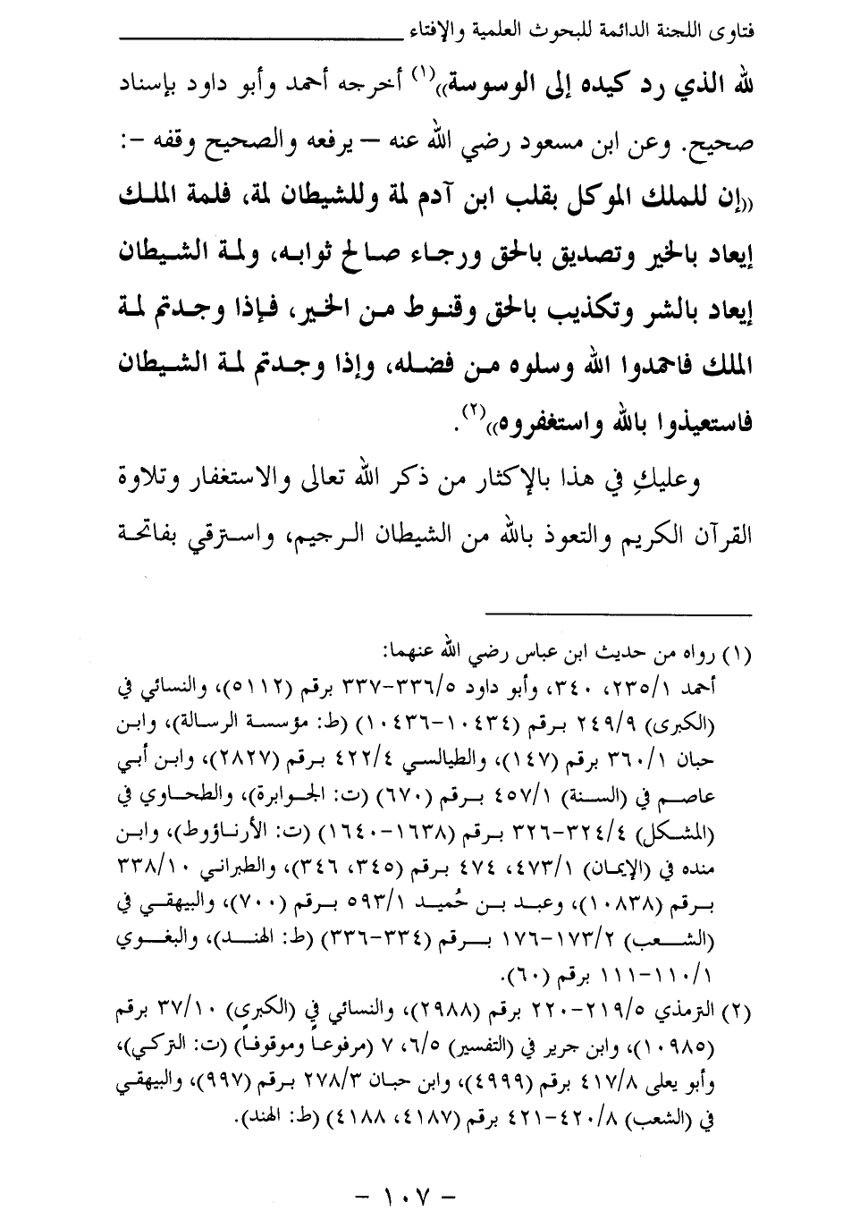 لله الذي رد كيده إلى الوسوسة (¬1) » أخرجه أحمد وأبو داود بإسناد صحيح. وعن ابن مسعود رضي الله عنه- يرفعه والصحيح وقفه-: «إن للملك الموكل بقلب ابن آدم لمة وللشيطان لمة، فلمة الملك إيعاد بالخير وتصديق بالحق ورجاء صالح ثوابه، ولمة الشيطان إيعاد بالشر وتكذيب بالحق وقنوط من الخير، فماذا وجدتم لمة الملك فاحمدوا الله وسلوه من فضله، وإذا وجدتم لمة الشيطان فاستعيذوا بالله واستغفروه (¬2) » .