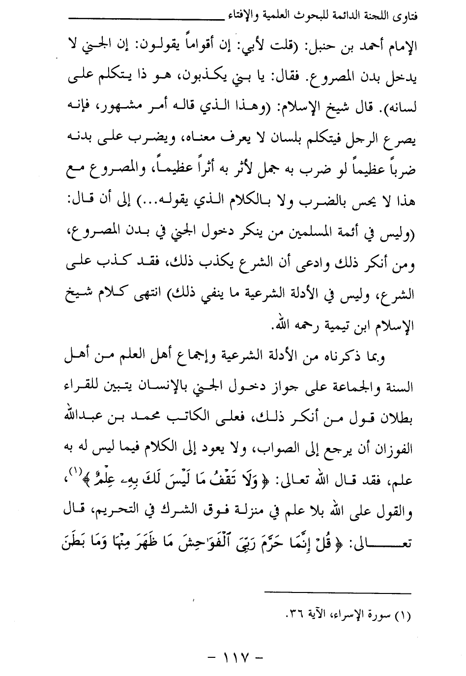 الإمام أحمد بن حنبل: (قلت لأبي: إن أقواما يقولون: إن الجني لا يدخل بدن المصروع. فقال: يا بني يكذبون، هو ذا يتكلم على لسانه) . قال شيخ الإسلام: (وهذا الذي قاله أمر مشهور، فإنه يصرع الرجل فيتكلم بلسان لا يعرف معناه، ويضرب على بدنه ضربا عظيما لو ضرب جمل لأثر به أثرا عظيما، والمصروع مع هذا لا يحس بالضرب ولا بالكلام الذي يقوله. . .) إلى أن قال: (وليس في أئمة المسلمين من ينكر دخول الجني في بدن المصروع، ومن أنكر ذلك وادعى أن الشرع يكذب ذلك، فقد كذب على الشرع، وليس في الأدلة الشرعية ما ينفي ذلك) انتهى كلام شيخ الإسلام ابن تيمية رحمه الله.