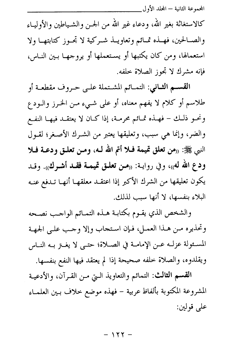 القسم الثاني: التمائم المشتملة على حروف مقطعة أو طلاسم أو كلام لا يفهم معناه، أو على شيء من الخرز والودع ونحو ذلك- فهذه تمائم محرمة، إذا كان لا يعتقد فيها النفع والضر، وإنما هي سبب، وتعليقها يعتبر من الشرك الأصغر؛ لقول النبي صلى الله عليه وسلم: «من تعلق تميمة فلا أتم الله له، ومن تعلق ودعة فلا ودع الله له (¬1) » ، وفي رواية «من تعلق تميمة فقد أشرك (¬2) » . وقد يكون تعليقها من الشرك الأكبر إذا اعتقد معلقها أنها تدفع عنه البلاء بنفسها، لا أنها سبب لذلك.