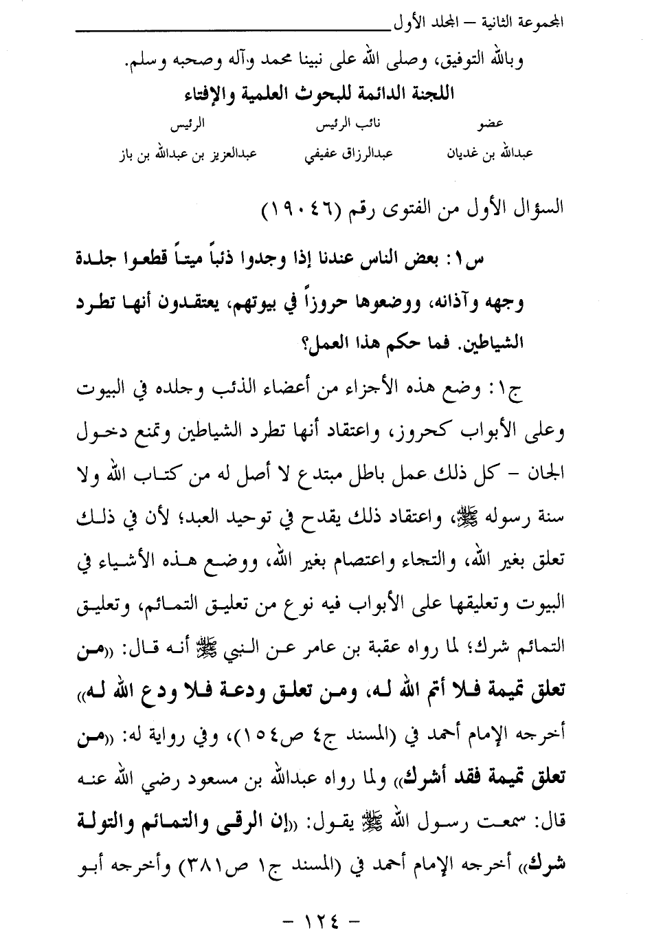 ج 1: وضع هذه الأجزاء من أعضاء الذئب وجلده في البيوت وعلى الأبواب كحروز، واعتقاد أنها تطرد الشياطين وتمنع دخول الجان - كل ذلك عمل باطل مبتدع لا أصل له من كتاب الله ولا سنة رسوله صلى الله عليه وسلم، واعتقاد ذلك يقدح في توحيد العبد؛ لأن في ذلك تعلق بغير الله، والتجاء واعتصام بغير الله، ووضع هذه الأشياء في البيوت وتعليقها على الأبواب فيه نوع من تعليق التمائم، وتعليق التمائم شرك؛ لما رواه عقبة بن عامر عن النبي صلى الله عليه وسلم أنه قال: «من تعلق تميمة فلا أتم الله له، ومن تعلق ودعة فلا ودع الله له (¬1) » أخرجه الإمام أحمد في (المسند ج 4 ص 154) ، وفي رواية له: «من تعلق تميمة فقد أشرك (¬2) » ولما رواه عبد الله بن مسعود رضي الله عنه قال: سمعت رسول الله صلى الله عليه وسلم يقول: «إن الرقى والتمائم والتولة شرك (¬3) » أخرجه الإمام أحمد في (المسند ج 1ص 381) وأخرجه أبو
