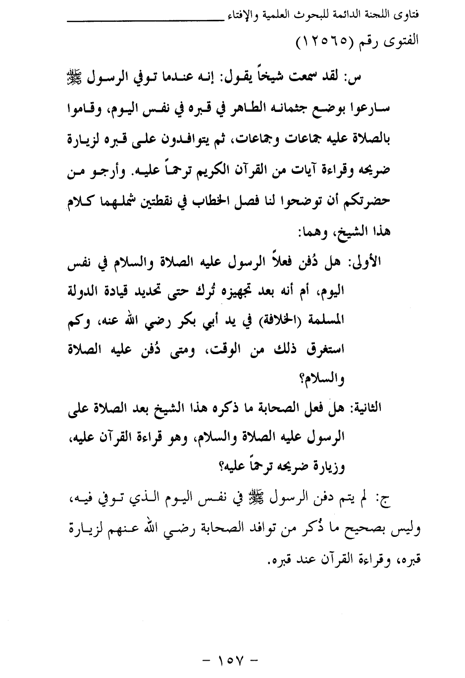 س: لقد سمعت شيخا يقول: إنه عندما توفي الرسول - صلى الله عليه وسلم - سارعوا بوضع جثمانه الطاهر في قبره في نفس اليوم، وقاموا بالصلاة عليه جماعات وجماعات، ثم يتوافدون على قبره لزيارة ضريحه وقراءة آيات من القرآن الكريم ترحما عليه. وأرجو من حضرتكم أن توضحوا لنا فصل الخطاب في نقطتين شملهما كلام هذا الشيخ، وهما: