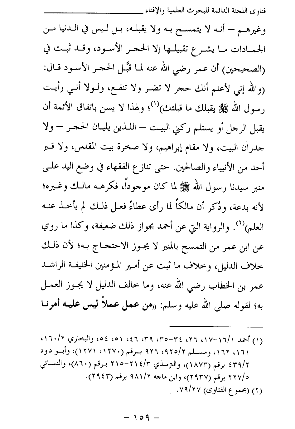 وغيرهم- أنه لا يتمسح به ولا يقبله، بل ليس في الدنيا من الجمادات ما يشرع تقبيلها إلا الحجر الأسود، وقد ثبت في (الصحيحين) أن عمر رضي الله عنه لما قبل الحجر الأسود قال: (والله إني لأعلم أنك حجر لا تضر ولا تنفع، ولولا أني رأيت رسول الله - صلى الله عليه وسلم - يقبلك ما قبلتك) ، ولهذا لا يسن باتفاق الأئمة أن يقبل الرجل أو يستلم ركني البيت - اللذين يليان الحجر- ولا جدران البيت، ولا مقام إبراهيم، ولا صخرة بيت المقدس، ولا قبر أحد من الأنبياء والصالحين. حتى تنازع الفقهاء في وضع اليد على منبر سيدنا رسول الله - صلى الله عليه وسلم - لما كان موجودا، فكرهه مالك وغيره؛ لأنه بدعة، وذكر أن مالكا لما رأى عطاء فعل ذلك لم يأخذ عنه العلم) (¬1) . والرواية التي عن أحمد بجواز ذلك ضعيفة، وكذا ما روي عن ابن عمر من التمسح بالمنبر لا يجوز الاحتجاج به؛ لأن ذلك خلاف الدليل، وخلاف ما ثبت عن أمير المؤمنين الخليفة الراشد عمر بن الخطاب رضي الله عنه، وما خالف الدليل لا يجوز العمل به لقوله - صلى الله عليه وسلم -: «من عمل عملا ليس عليه أمرنا