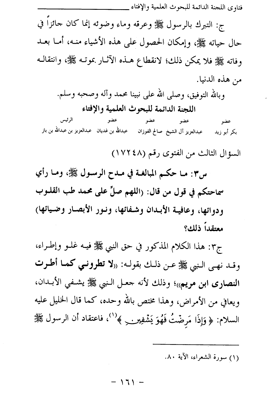 س3: ما حكم المبالغة في مدح الرسول - صلى الله عليه وسلم -، وما رأي سماحتكم في قول من قال: اللهم صل على محمد طب القلوب ودوائها، وعافية الأبدان وشفائها، ونور الأبصار وضيائها) معتقدا ذلك؟
