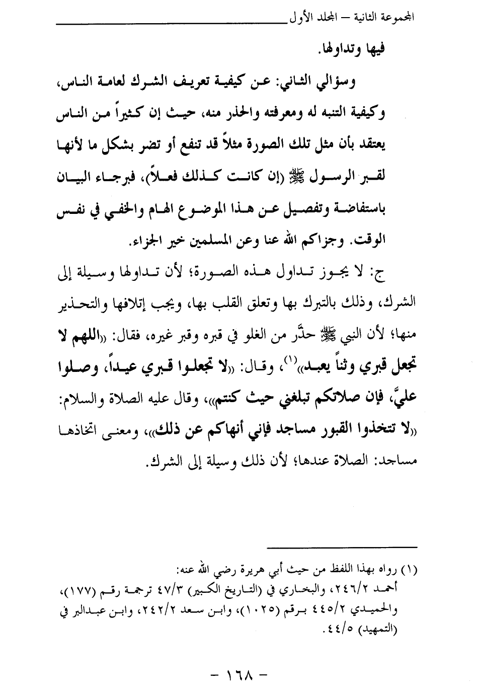 ج: لا يجوز تداول هذه الصورة؛ لأن تداولها وسيلة إلى الشرك، وذلك بالتبرك بها وتعلق القلب بها، ويجب إتلافها والتحذير منها؛ لأن النبي حذر من الغلو في قبره وقبر غيره، فقال: «اللهم لا تجعل قبري وثنا يعبد (¬1) » ، وقال: «لا تجعلوا قبري عيدا، وصلوا علي، فإن صلاتكم تبلغني حيث كنتم (¬2) » ، وقال عليه الصلاة والسلام: «لا تتخذوا القبور مساجد فإني أنهاكم عن ذلك (¬3) » ، ومعنى اتخاذها مساجد: الصلاة عندها؛ لأن ذلك وسيلة إلى الشرك.