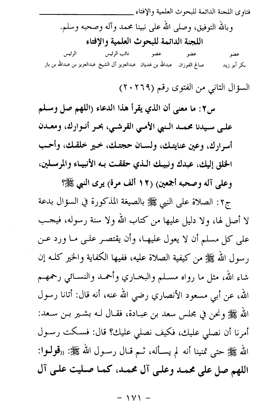 ج2: الصلاة على النبي - صلى الله عليه وسلم - بالصيغة المذكورة في السؤال بدعة لا أصل لها، ولا دليل عليها من كتاب الله ولا سنة رسوله، فيجب على كل مسلم أن لا يعول عليها، وأن يقتصر على ما ورد عن رسول الله - صلى الله عليه وسلم - من كيفية الصلاة عليه، ففيها الكفاية والخير كله إن شاء الله، مثل ما رواه مسلم والبخاري وأحمد والنسائي رحمهم الله، عن أبي مسعود الأنصاري رضي الله عنه، أنه قال: «أتانا رسول الله - صلى الله عليه وسلم - ونحن في مجلس سعد بن عبادة، فقال له بشير بن سعد: أمرنا أن نصلي عليك، فكيف نصلي عليك؟ قال: فسكت رسول الله - صلى الله عليه وسلم - حتى تمنينا أنه لم يسأله، ثم قال رسول الله - صلى الله عليه وسلم -: " قولوا: اللهم صل على محمد وعلى آل محمد، كما صليت على آل