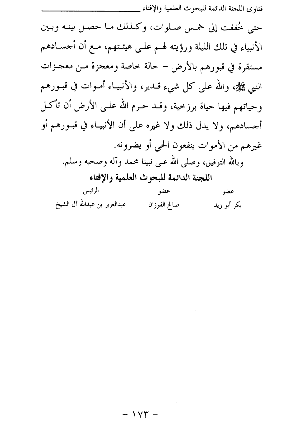 حتى خففت إلى خمس صلوات، وكذلك ما حصل بينه وبين الأنبياء في تلك الليلة ورؤيته لهم على هيئتهم، مع أن أجسادهم مستقرة في قبورهم بالأرض- حالة خاصة ومعجزة من معجزات النبي - صلى الله عليه وسلم -، والله على كل شيء قدير، والأنبياء أموات في قبورهم وحياتهم فيها حياة برزخية، وقد حرم الله على الأرض أن تأكل أجسادهم، ولا يدل ذلك ولا غيره على أن الأنبياء في قبورهم أو غيرهم من الأموات ينفعون الحي أو يضرونه.