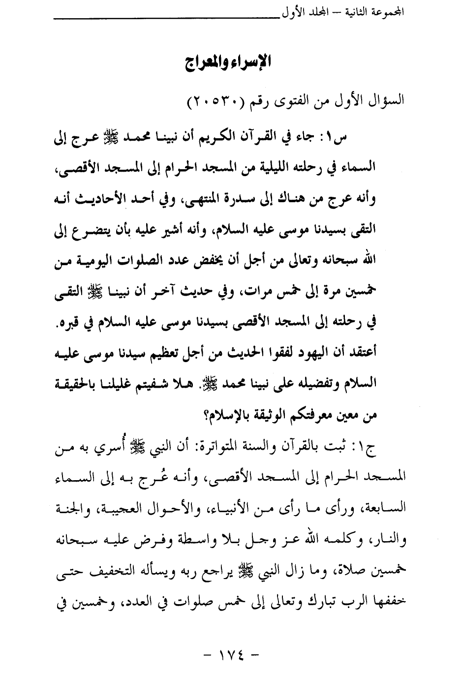 ج 1: ثبت بالقرآن والسنة المتواترة: أن النبي - صلى الله عليه وسلم - أسري به من المسجد الحرام إلى المسجد الأقصى، وأنه عرج به إلى السماء السابعة، ورأى ما رأى من الأنبياء، والأحوال العجيبة، والجنة والنار، وكلمه الله عز وجل بلا واسطة وفرض عليه سبحانه خمسين صلاة، وما زال النبي - صلى الله عليه وسلم - يراجع ربه ويسأله التخفيف حتى خففها الرب تبارك وتعالى إلى خمس صلوات في العدد، وخمسين في