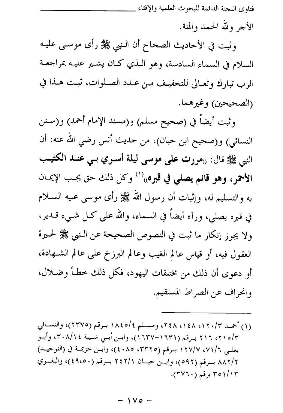 وثبت أيضا في (صحيح مسلم) و (مسند الإمام أحمد) و (سنن النسائي) و (صحيح ابن حبان) ، من حديث أنس رضي الله عنه: أن النبي - صلى الله عليه وسلم - قال: «مررت على موسى ليلة أسري عند الكثيب الأحمر، وهو قائم يصلي في قبره (¬1) » وكل ذلك حق يجب الإيمان به والتسليم له، وإثبات أن رسول الله - صلى الله عليه وسلم - رأى موسى عليه السلام في قبره يصلي، ورآه أيضا في السماء، والله على كل شيء قدير، ولا يجوز إنكار ما ثبت في النصوص الصحيحة عن النبي - صلى الله عليه وسلم - لحيرة العقول فيه، أو قياس عالم الغيب وعالم البرزخ على عالم الشهادة، أو دعوى أن ذلك من مختلقات اليهود، فكل ذلك خطأ وضلال، وانحراف عن الصراط المستقيم.