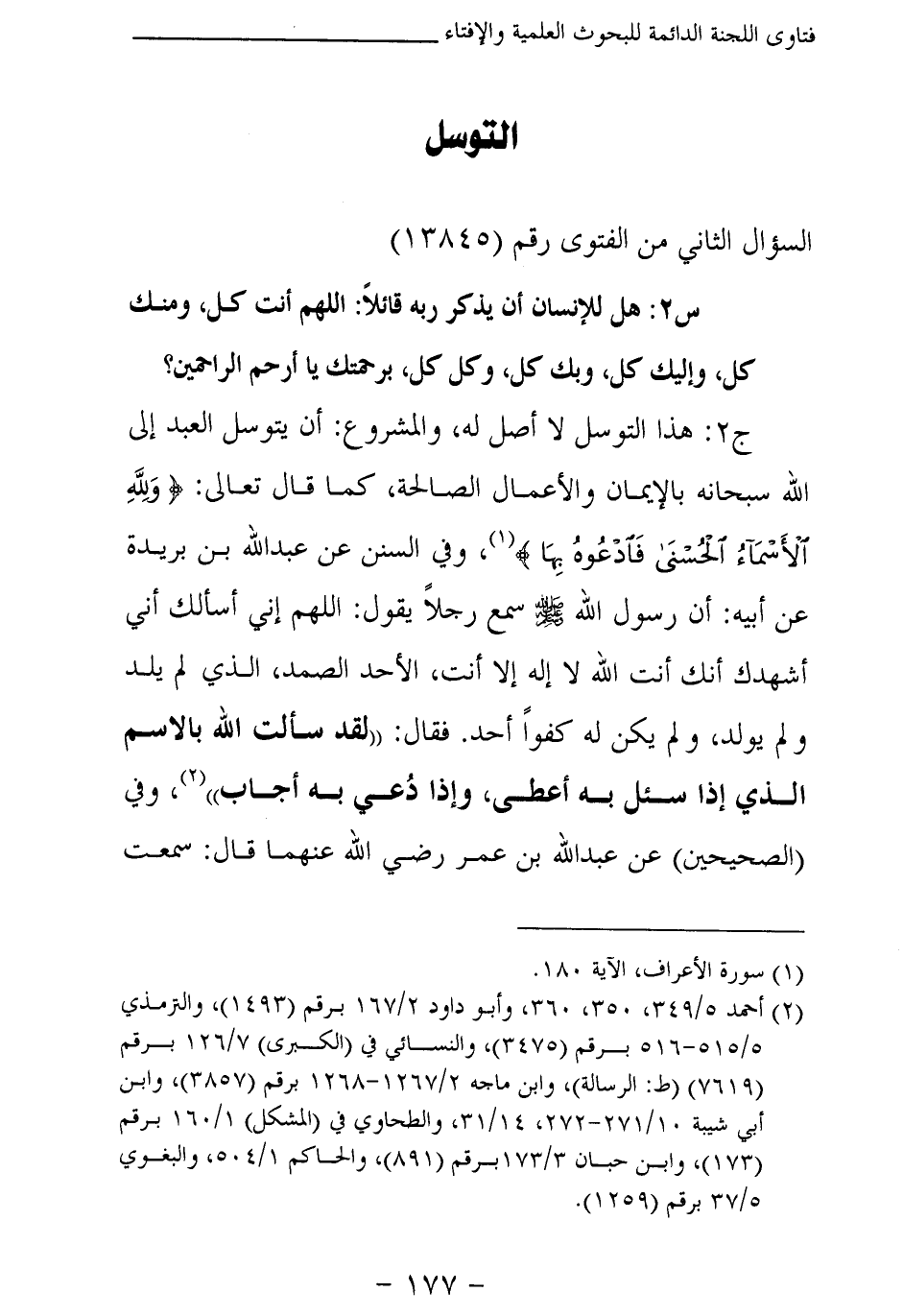 ج2: هذا التوسل لا أصل له، والمشروع: أن يتوسل العبد إلى الله سبحانه بالإيمان والأعمال الصالحة، كما قال تعالى: {وَلِلَّهِ الْأَسْمَاءُ الْحُسْنَى فَادْعُوهُ بِهَا} (¬1) ، وفي السنن عن عبد الله بن بريدة عن أبيه: «أن رسول الله - صلى الله عليه وسلم - سمع رجلا يقول: اللهم إني أسألك أني أشهدك أنك أنت الله لا إله إلا أنت، الأحد الصمد، الذي لم يلد ولم يولد، ولم يكن له كفوا أحد. فقال: (لقد سألت الله بالاسم الذي إذا سئل به أعطى، وإذا دعي به أجاب (¬2) » ، وفي (الصحيحين) عن عبد الله بن عمر رضي الله عنهما قال: سمعت