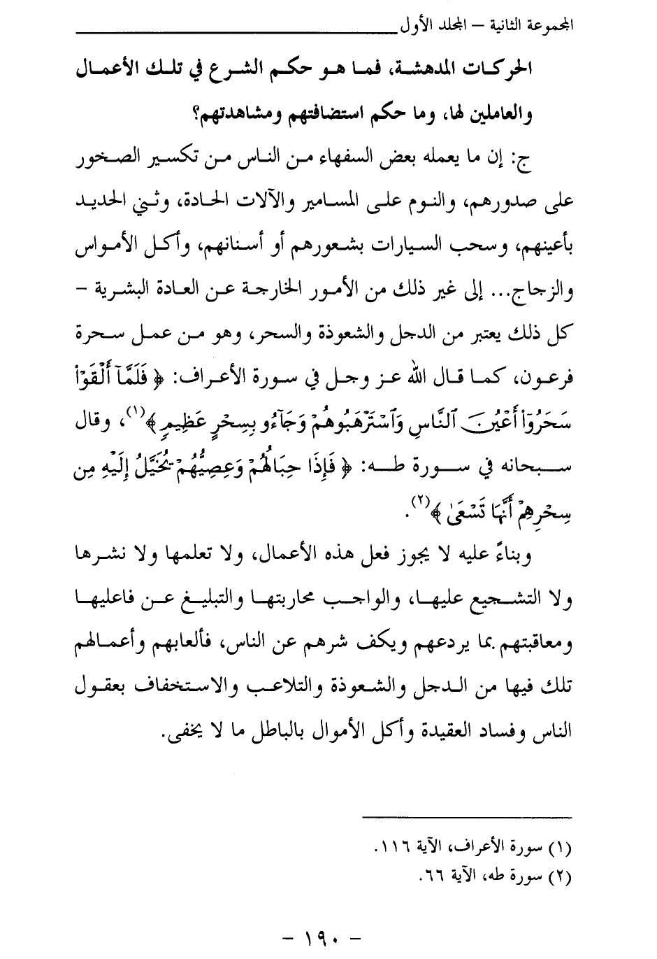 ج: إن ما يعمله بعض السفهاء من الناس من تكسير الصخور على صدورهم، والنوم على المسامير والآلات الحادة، وثني الحديد بأعينهم، وسحب السيارات بشعورهم أو أسنانهم، وأكل الأمواس والزجاج. . . إلى غير ذلك من الأمور الخارجة عن العادة البشرية - كل ذلك يعتبر من الدجل والشعوذة والسحر، وهو من عمل سحرة فرعون، كما قال الله عز وجل في سورة الأعراف: {فَلَمَّا أَلْقَوْا سَحَرُوا أَعْيُنَ النَّاسِ وَاسْتَرْهَبُوهُمْ وَجَاءُوا بِسِحْرٍ عَظِيمٍ} (¬1) ، وقال سبحانه في سورة طه: {فَإِذَا حِبَالُهُمْ وَعِصِيُّهُمْ يُخَيَّلُ إِلَيْهِ مِنْ سِحْرِهِمْ أَنَّهَا تَسْعَى} (¬2) وبناء عليه لا يجوز فعل هذه الأعمال، ولا تعلمها ولا نشرها ولا التشجيع عليها، والواجب محاربتها والتبليغ عن فاعليها ومعاقبتهم. بما يردعهم ويكف شرهم عن الناس، فألعابهم وأعمالهم تلك فيها من الدجل والشعوذة والتلاعب والاستخفاف بعقول الناس وفساد العقيدة وأكل الأموال بالباطل ما لا يخفى.