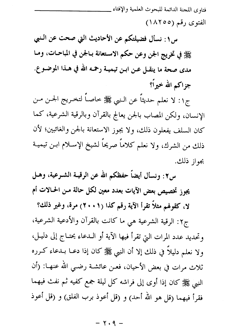 ج1: لا نعلم حديثا عن النبي - صلى الله عليه وسلم - خاصا لتخريج الجن من الإنسان، ولكن المصاب بالجن يعالج بالقرآن وبالرقية الشرعية، كما كان السلف يفعلون ذلك، ولا يجوز الاستعانة بالجن والغائبين؛ لأن ذلك من الشرك، ولا نعلم كلاما صريحا لشيخ الإسلام ابن تيمية بجواز ذلك.