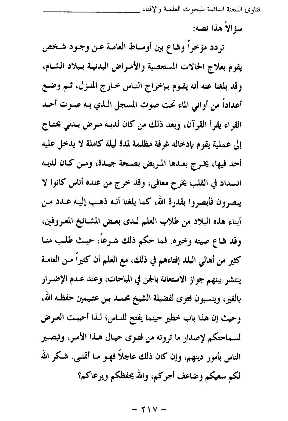 سؤالا هذا نصه: تردد مؤخرا وشاع بين أوساط العامة عن وجود شخص يقوم بعلاج الحالات المستعصية والأمراض البدنية ببلاد الشام، وقد بلغنا عنه أنه يقوم بإخراج الناس خارج المنزل، ثم وضع أعدادا من أواني الماء تحت صوت المسجل الذي به صوت أحد القراء يقرأ القرآن، وبعد ذلك من كان لديه مرض بدني يحتاج إلى عملية يقوم بإدخاله غرفة مظلمة لمدة ليلة كاملة لا يدخل عليه أحد فيها، يخرج بعدها المريض بصحة جيدة، ومن كان لديه انسداد في القلب يخرج معافى، وقد خرج من عنده أناس كانوا لا يبصرون فأبصروا بقدرة الله، كما بلغنا أنه ذهب إليه عدد من أبناء هذه البلاد من طلاب العلم لدى بعض المشائخ المعروفين، وقد شاع صيته وخبره فما حكم ذلك شرعا، حيث طلب منا كثير من أهالي البلد إفتاءهم في ذلك، مع العلم أن كثيرا من العامة ينتشر بينهم جواز الاستعانة بالجن في المباحات، وعند عدم الإضرار بالغير، وينسبون فتوى لفضيلة الشيخ محمد بن عثيمين حفظه الله، وحيث إن هذا باب خطير حينما يفتح للناس؛ لذا أحببت العرض لسماحتكم لإصدار ما ترونه من فتوى حيال هذا الأمر، وتبصير الناس بأمور دينهم، وإن كان ذلك عاجلا فهو ما أتمنى. شكر الله لكم سعيكم وضاعف أجركم، والله يحفظكم ويرعاكم؟