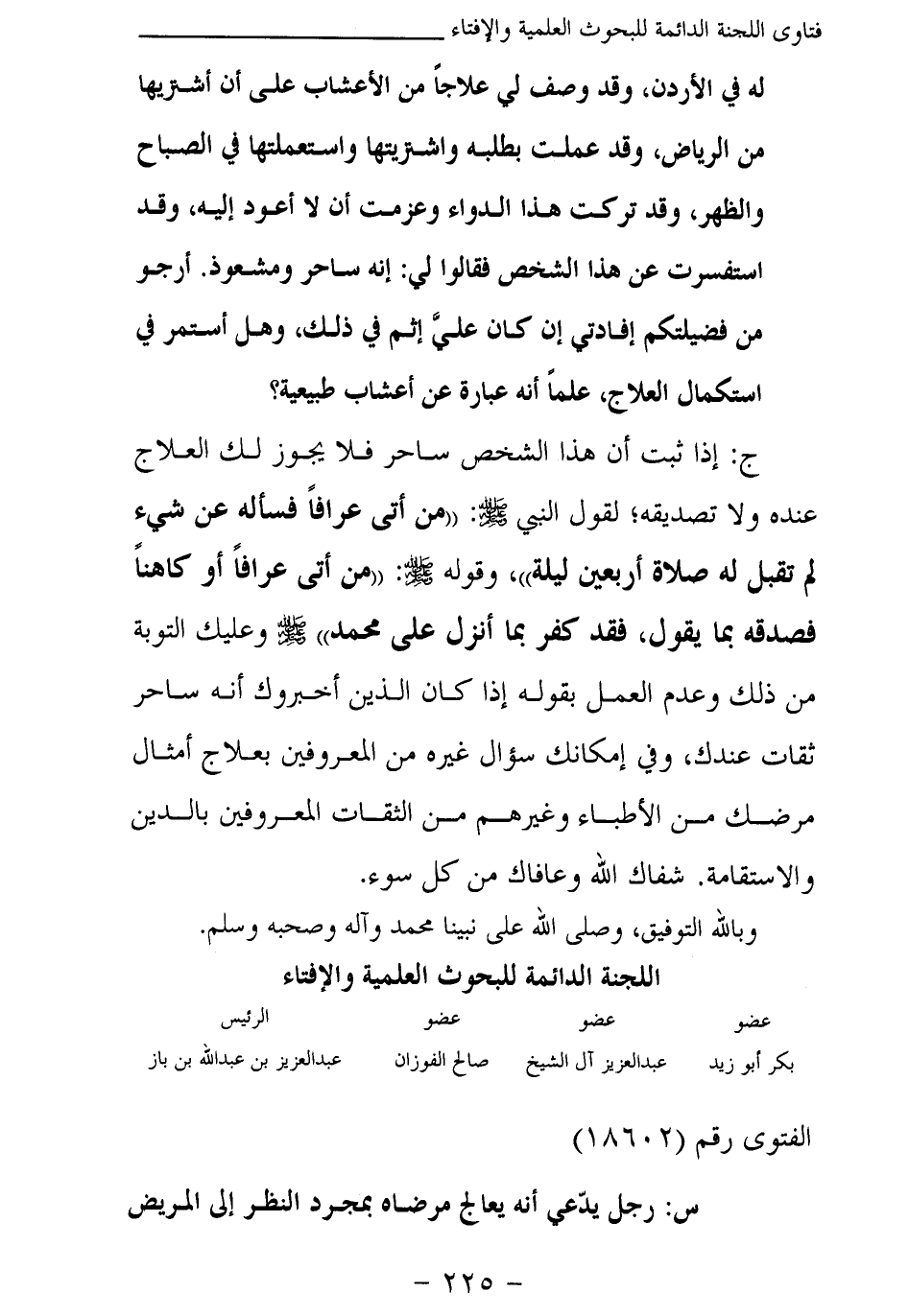ج: إذا ثبت أن هذا الشخص ساحر فلا يجوز لك العلاج عنده ولا تصديقه؛ لقول النبي - صلى الله عليه وسلم -: «من أتى عرافا فسأله عن شيء لم تقبل له صلاة أربعين ليلة (¬1) » ، وقوله - صلى الله عليه وسلم -: «من أتى عرافا أو كاهنا فصدقه بما يقول، فقد كفر بما أنزل على محمد (¬2) » - صلى الله عليه وسلم - وعليك التوبة من ذلك وعدم العمل بقوله إذا كان الذين أخبروك أنه ساحر ثقات عندك، وفي إمكانك سؤال غيره من المعروفين بعلاج أمثال مرضك من الأطباء وغيرهم من الثقات المعروفين بالدين والاستقامة. شفاك الله وعافاك من كل سوء.