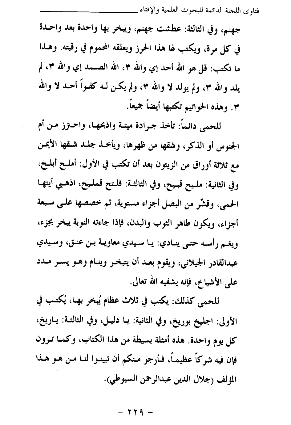 للحمى كذلك: يكتب في ثلاث عظام يبخر بها، يكتب في الأولى: إجليخ بوريخ، وفي الثانية: يا دليل، وفي الثالثة: ياريخ، كل يوم واحدة. هذه أمثلة بسيطة من هذا الكتاب، وكما ترون بأن فيه شركا عظيما، فأرجو منكم أن تبينوا لنا من هو هذا المؤلف (جلال الدين عبد الرحمن السيوطي) .