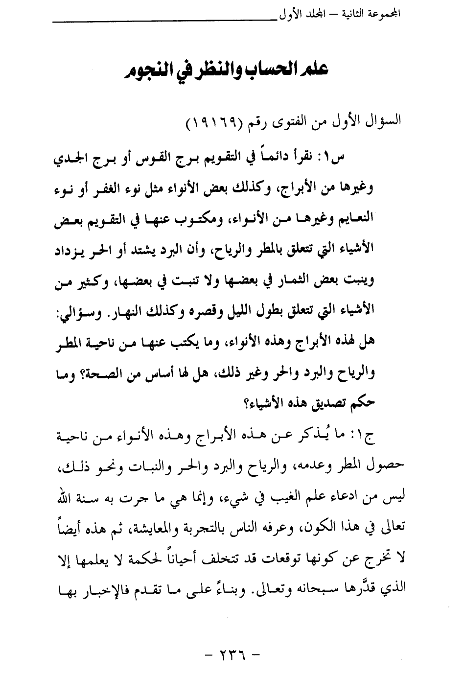 س1: نقرأ دائما في التقويم برج القوس أو برج الجدي وغيرها من الأبراج، وكذلك بعض الأنواء مثل نوء الغفر أو نوء النعايم وغيرها من الأنواء، ومكتوب عنها التقويم بعض الأشياء التي تتعلق بالمطر والرياح، وأن البرد يشتد أو الحر يزداد وينبت بعض الثمار في بعضها ولا تنبت في بعضها، وكثير من الأشياء التي تتعلق بطول الليل وقصره وكذلك النهار. وسؤالي: هل لهذه الأبراج وهذه الأنواء، وما يكتب عنها من ناحية المطر والرياح والبرد والحر وغير ذلك، هل لها أساس من الصحة؟ وما حكم تصديق هذه الأشياء؟
