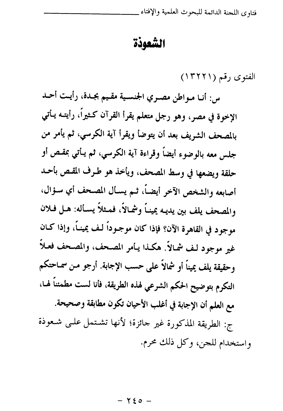 س: أنا مواطن مصري الجنسية مقيم بجدة، رأيت أحد الإخوة في مصر، وهو رجل متعلم يقرأ القرآن كثيرا، رأيته يأتي بالمصحف الشريف بعد أن يتوضأ ويقرأ آية الكرسي، ثم يأمر من جلس معه بالوضوء أيضا وقراءة آية الكرسي، ثم يأتي بمقص أو حلقة ويضعها في وسط المصحف، ويأخذ هو طرف المقص بأحد أصابعه والشخص الآخر أيضا، ثم يسأل المصحف أي سؤال، والمصحف يلف بين يديه يمينا وشمالا، فمثلا يسأله: هل فلان موجود في القاهرة الآن؟ فإذا كان موجودا لف يمينا، وإذا كان غير موجود لف شمالا. هكذا يأمر المصحف، والمصحف فعلا وحقيقة يلف يمينا أو شمالا على حسب الإجابة. أرجو من سماحتكم التكرم بتوضيح الحكم الشرعي لهذه الطريقة، فأنا لست مطمئنا لها، مع العلم أن الإجابة في أغلب الأحيان تكون مطابقة وصحيحة.