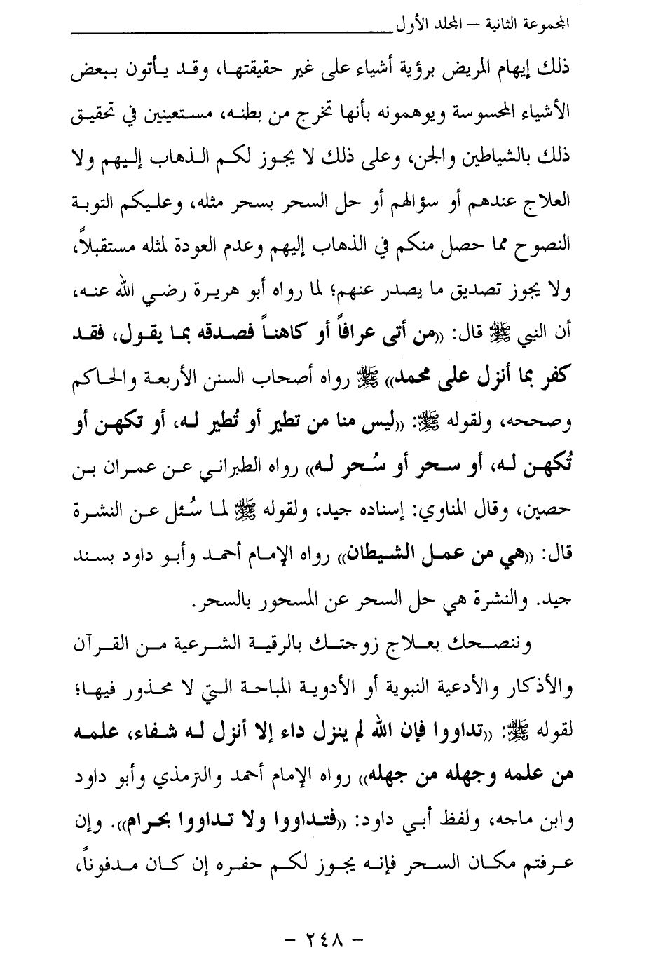 وننصحك بعلاج زوجتك بالرقية الشرعية من القرآن والأذكار والأدعية النبوية أو الأدوية المباحة التي لا محذور فيها؛ لقوله - صلى الله عليه وسلم -: «تداووا فإن الله لم ينزل داء إلا أنزل له شفاء، علمه من علمه وجهله من جهله (¬3) » رواه الإمام أحمد والترمذي وأبو داود وابن ماجه، ولفظ أبي داود: «فتداووا ولا تداووا بحرام (¬4) » . وإن عرفتم مكان السحر فإنه يجوز لكم حفره إن كان مدفونا،