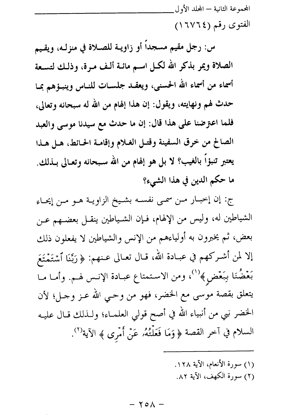 ج: إن إخبار من سمى نفسه بشيخ الزاوية هو من إيحاء الشياطين له، وليس من الإلهام، فإن الشياطين ينقل بعضهم عن بعض، ثم يخبرون به أولياءهم من الإنس والشياطين لا يفعلون ذلك إلا لمن أشركهم في عبادة الله، قال تعالى عنهم: {رَبَّنَا اسْتَمْتَعَ بَعْضُنَا بِبَعْضٍ} (¬1) ، ومن الاستمتاع عبادة الإنس لهم. وأما ما يتعلق بقصة موسى مع الخضر، فهو من وحي الله عز وجل؛ لأن الخضر نبي من أنبياء الله في أصح قولي العلماء، ولذلك قال عليه السلام في آخر القصة {وَمَا فَعَلْتُهُ عَنْ أَمْرِي} (¬2)