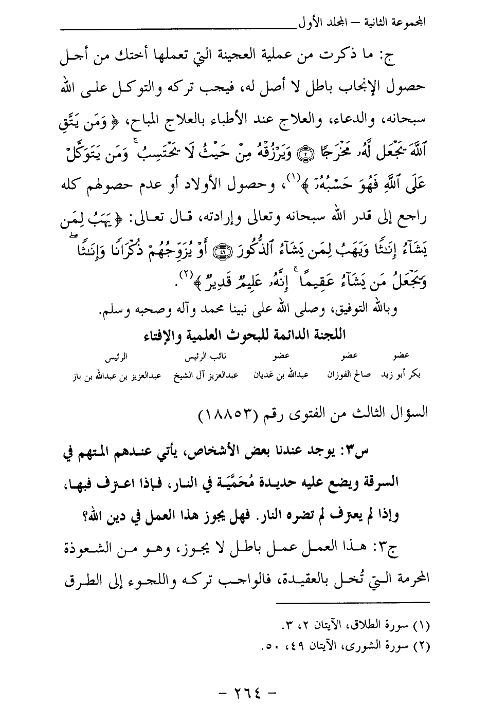 ج: ما ذكرت من عملية العجينة التي تعملها أختك من أجل حصول الإنجاب باطل لا أصل له، فيجب تركه والتوكل على الله سبحانه، والدعاء، والعلاج عند الأطباء بالعلاج المباح، {وَمَنْ يَتَّقِ اللَّهَ يَجْعَلْ لَهُ مَخْرَجًا} (¬1) {وَيَرْزُقْهُ مِنْ حَيْثُ لَا يَحْتَسِبُ وَمَنْ يَتَوَكَّلْ عَلَى اللَّهِ فَهُوَ حَسْبُهُ} (¬2) ، وحصول الأولاد أو عدم حصولهم كله راجع إلى قدر الله سبحانه وتعالى وإرادته، قال تعالى: {يَهَبُ لِمَنْ يَشَاءُ إِنَاثًا وَيَهَبُ لِمَنْ يَشَاءُ الذُّكُورَ} (¬3) {أَوْ يُزَوِّجُهُمْ ذُكْرَانًا وَإِنَاثًا وَيَجْعَلُ مَنْ يَشَاءُ عَقِيمًا إِنَّهُ عَلِيمٌ قَدِيرٌ} (¬4) .