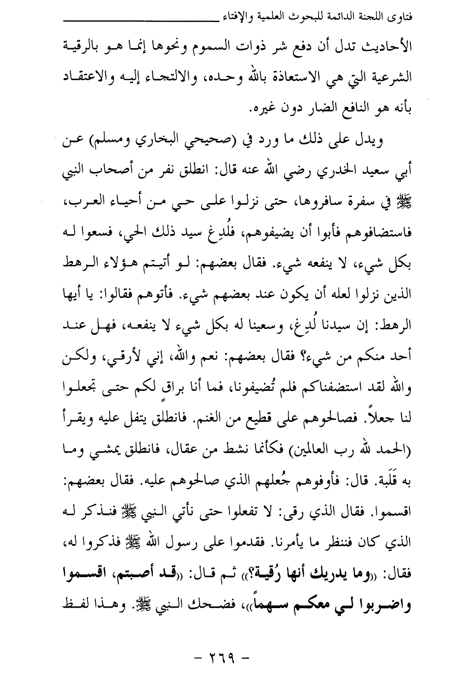 ويدل على ذلك ما ورد في (صحيحي البخاري ومسلم) «عن أبي سعيد الخدري - رضي الله عنه - قال: انطلق نفر من أصحاب النبي - صلى الله عليه وسلم - في سفرة سافروها، حتى نزلوا على حي من أحياء العرب، فاستضافوهم فأبوا أن يضيفوهم، فلدغ سيد ذلك الحي، فسعوا له بكل شيء، لا ينفعه شيء. فقال بعضهم: لو أتيتم هؤلاء الرهط الذين نزلوا لعله أن يكون عند بعضهم شيء. فأتوهم فقالوا: يا أيها الرهط: إن سيدنا لدغ، وسعينا له بكل شيء لا ينفعه، فهل عند أحد منكم من شيء؟ فقال بعضهم: نعم والله، إني لأرقي، ولكن والله لقد استضفناكم فلم تضيفونا، فما أنا براق لكم حتى تجعلوا لنا جعلا. فصالحوهم على قطيع من الغنم. فانطلق يتفل عليه ويقرأ فكأنما نشط من عقال، فانطلق يمشي وما به قلبة. قال: فأوفوهم جعلهم الذي صالحوهم عليه. فقال بعضهم: اقسموا فقال الذي رقى: لا تفعلوا حتى نأتي النبي - صلى الله عليه وسلم - فنذكر له الذي كان فننظر ما يأمرنا فقدموا على رسول الله - صلى الله عليه وسلم - فذكروا له، فقال: " وما يدريك أنها رقية؟ " ثم قال: " قد أصبتم، اقسموا واضربوا لي معكم سهما "، فضحك النبي - صلى الله عليه وسلم (¬2) » - وهذا لفظ