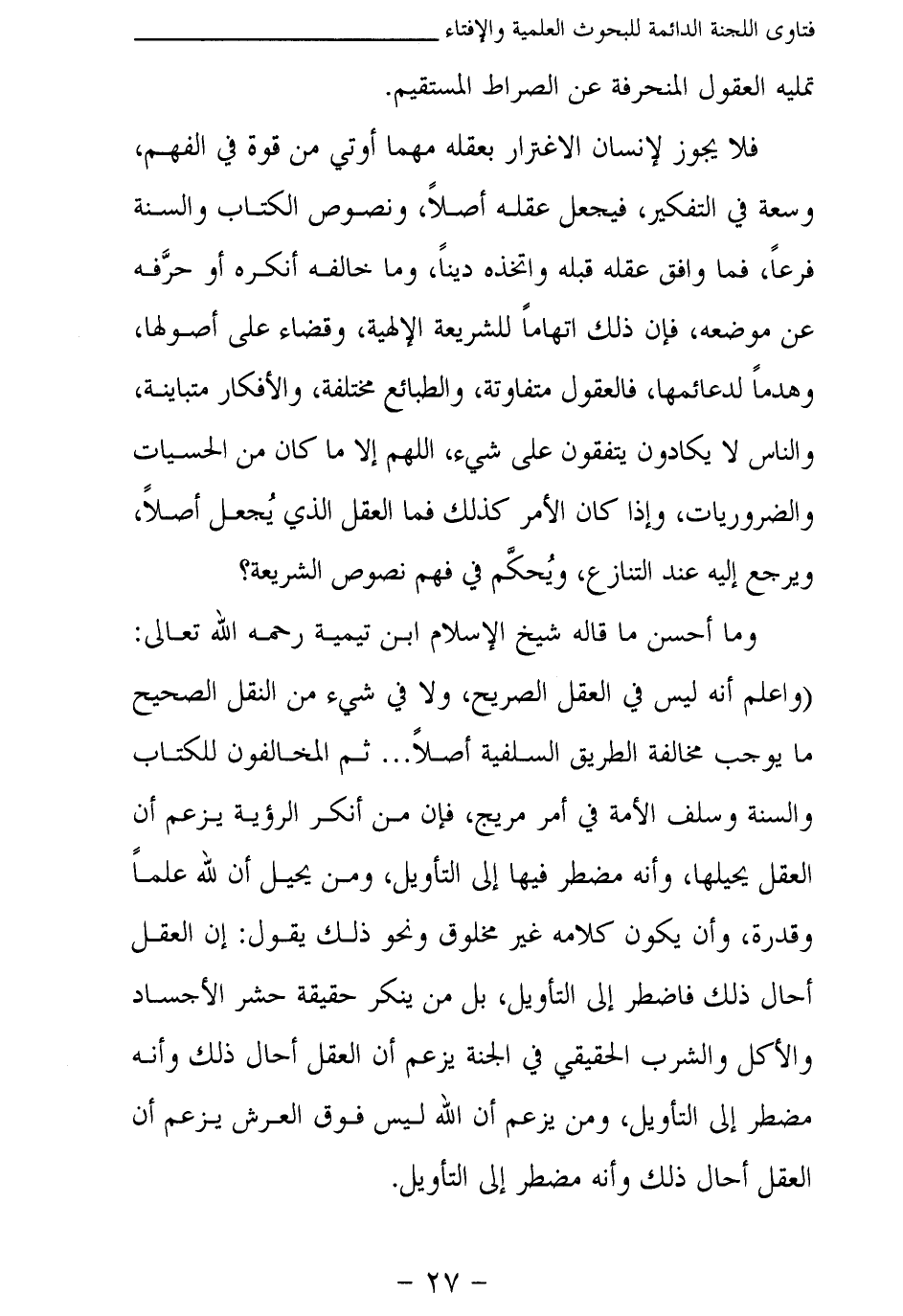 فلا يجوز لإنسان الاغترار بعقله مهما أوتي من قوة في الفهم، وسعة في التفكير، فيجعل عقله أصلا، ونصوص الكتاب والسنة فرعا، فما وافق عقله قبله واتخذه دينا، وما خالفه أنكره أو حرفه عن موضعه، فإن ذلك اتهاما للشريعة الإلهية، وقضاء على أصولها، وهدما لدعائمها، فالعقول متفاوتة، والطبائع مختلفة، والأفكار متباينة، والناس لا يكادون يتفقون على شيء، اللهم إلا ما كان من الحسيات والضروريات، وإذا كان الأمر كذلك فما العقل الذي يجعل أصلا، ويرجع إليه عند التنازع، ويحكم في فهم نصوص الشريعة؟
