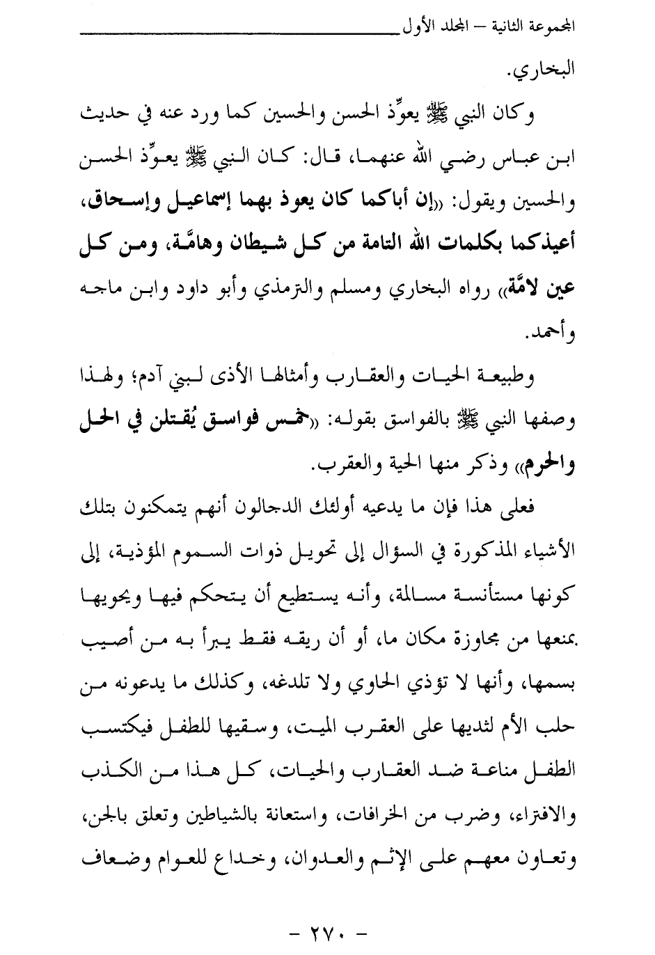 وكان النبي - صلى الله عليه وسلم - يعوذ الحسن والحسين، كما ورد عنه في حديث ابن عباس - رضي الله عنهما -، قال: «كان النبي - صلى الله عليه وسلم - يعوذ الحسن والحسين ويقول: " إن أباكما كان يعوذ بهما إسماعيل وإسحاق، أعيذكما بكلمات الله التامة من كل شيطان وهامة، ومن كل عين لامة (¬1) » رواه البخاري ومسلم والترمذي وأبو داود وابن ماجه وأحمد.