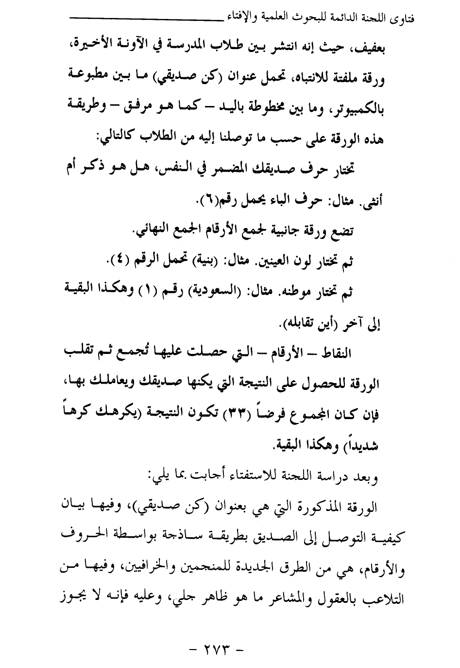 الورقة المذكورة التي هي بعنوان (كن صديقي) ، وفيها بيان كيفية التوصل إلى الصديق بطريقة ساذجة بواسطة الحروف والأرقام، هي من الطرق الجديدة للمنجمين والخرافيين، وفيها من التلاعب بالعقول والمشاعر ما هو ظاهر جلي، وعليه فإنه لا يجوز