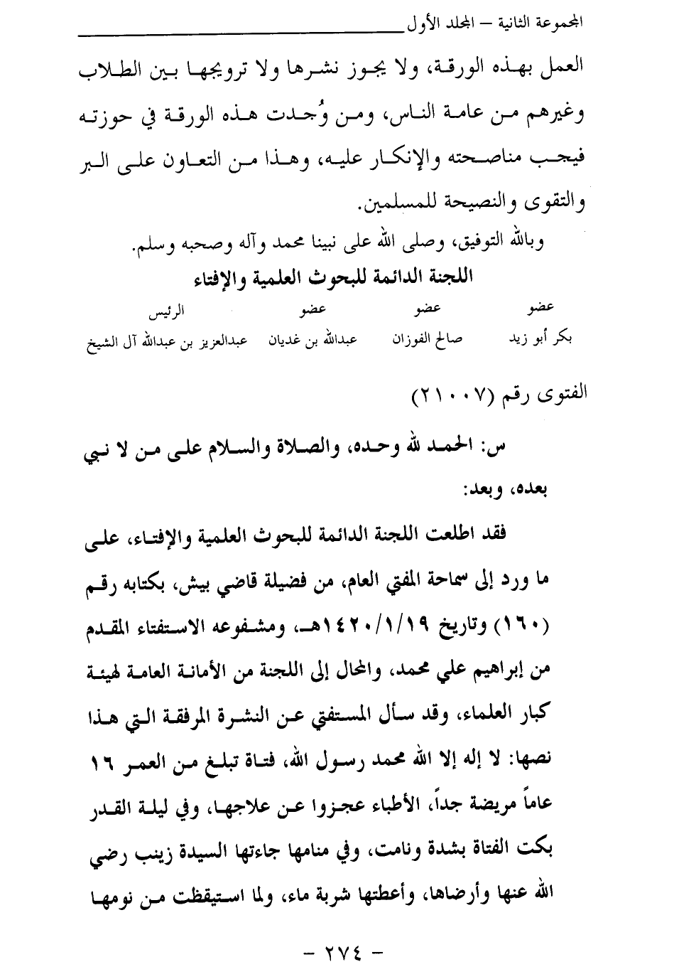 فقد اطلعت اللجنة الدائمة للبحوث العلمية والإفتاء، على ما ورد إلى سماحة المفتي العام، من فضيلة قاضي بيش، بكتابه رقم (160) وتاريخ 19\ 1\ 1420 هـ، ومشفوعه الاستفتاء المقدم من إبراهيم علي محمد، والمحال إلى اللجنة من الأمانة العامة لهيئة كبار العلماء، وقد سأل المستفتي عن النشرة المرفقة التي هذا نصها: لا إله إلا الله محمد وسول الله، فتاة تبلغ من العمر 16 عاما مريضة جدا، الأطباء عجزوا عن علاجها، وفي ليلة القدر بكت الفتاة بشدة ونامت، وفي منامها جاءتها السيدة زينب - رضي الله عنها - وأرضاها، وأعطتها شربة ماء، ولما استيقظت من نومها
