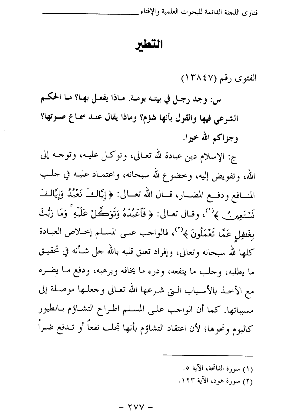 ج: الإسلام دين عبادة لله تعالى، وتوكل عليه، وتوجه إلى الله، وتفويض إليه، وخضوع لله سبحانه، واعتماد عليه في جلب المنافع ودفع المضار، قال الله تعالى: {إِيَّاكَ نَعْبُدُ وَإِيَّاكَ نَسْتَعِينُ} (¬1) وقال تعالى: {فَاعْبُدْهُ وَتَوَكَّلْ عَلَيْهِ وَمَا رَبُّكَ بِغَافِلٍ عَمَّا تَعْمَلُونَ} (¬2) ، فالواجب على المسلم إخلاص العبادة كلها لله سبحانه وتعالى، وإفراد تعلق قلبه بالله جل شأنه في تحقيق ما يطلبه، وجلب ما ينفعه، ودرء ما يخافه ويرهبه، ودفع ما يضره مع الأخذ بالأسباب التي شرعها الله تعالى وجعلها موصلة إلى مسبباتها. كما أن الواجب على المسلم اطراح التشاؤم بالطيور كالبوم ونحوها؛ لأن اعتقاد التشاؤم بأنها تجلب نفعا أو تدفع ضرا