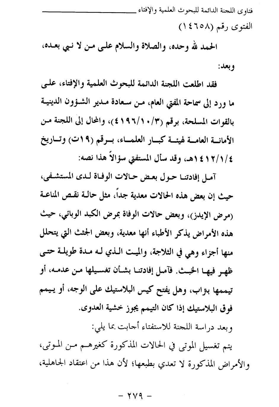 فقد اطلعت اللجنة الدائمة للبحوث العلمية والإفتاء، على ما ورد إلى سماحة المفتي العام، من سعادة مدير الشؤون الدينية بالقوات المسلحة، برقم (3\10\4196) ، والمحال إلى اللجنة من الأمانة العامة لهيئة كبار العلماء، برقم (19 ت) وتاريخ 4\1\1412هـ وقد سأل المستفتي سؤالا هذا نصه: آمل إفادتنا حول بعض حالات الوفاة لدى المستشفى، حيث إن بعض هذه الحالات معدية جدا، مثل حالة نقص المناعة (مرض الإيدز) ، وبعض حالات الوفاة بمرض الكبد الوبائي، حيث هذه الأمراض يذكر الأطباء أنها معدية، وبعض الجثث التي يتحلل منها أجزاء وهي في الثلاجة، والميت الذي له مدة طويلة حتى ظهر فيها الخبث. فآمل إفادتنا بشأن تغسيلها من عدمه، أو تيممها بتراب، وهل يفتح كيس البلاستيك على الوجه، أو ييمم فوق البلاستيك إذا كان التيمم يجوز خشية العدوى.
