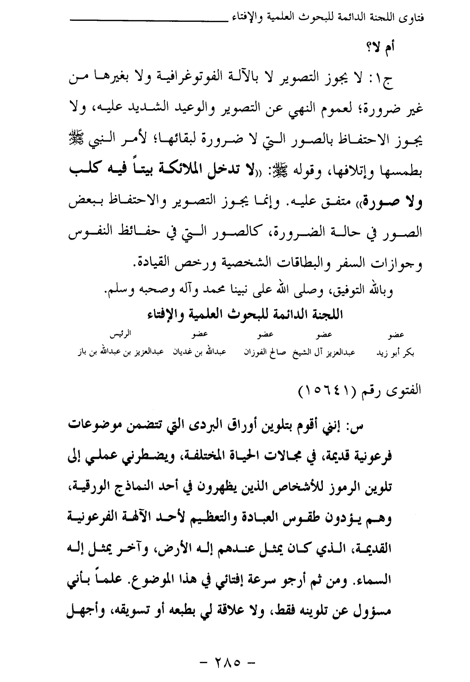 ج1: لا يجوز التصوير لا بالآلة الفوتوغرافية ولا بغيرها من غير ضرورة؛ لعموم النهي عن التصوير والوعيد الشديد عليه، ولا يجوز الاحتفاظ بالصور التي لا ضرورة لبقائها؛ لأمر النبي - صلى الله عليه وسلم - بطمسها وإتلافها، وقوله - صلى الله عليه وسلم -: «لا تدخل الملائكة بيتا فيه كلب ولا صورة (¬1) » متفق عليه. وإنما يجوز التصوير والاحتفاظ ببعض الصور في حالة الضرورة، كالصور التي في حفائظ النفوس وجوازات السفر والبطاقات الشخصية ورخص القيادة.