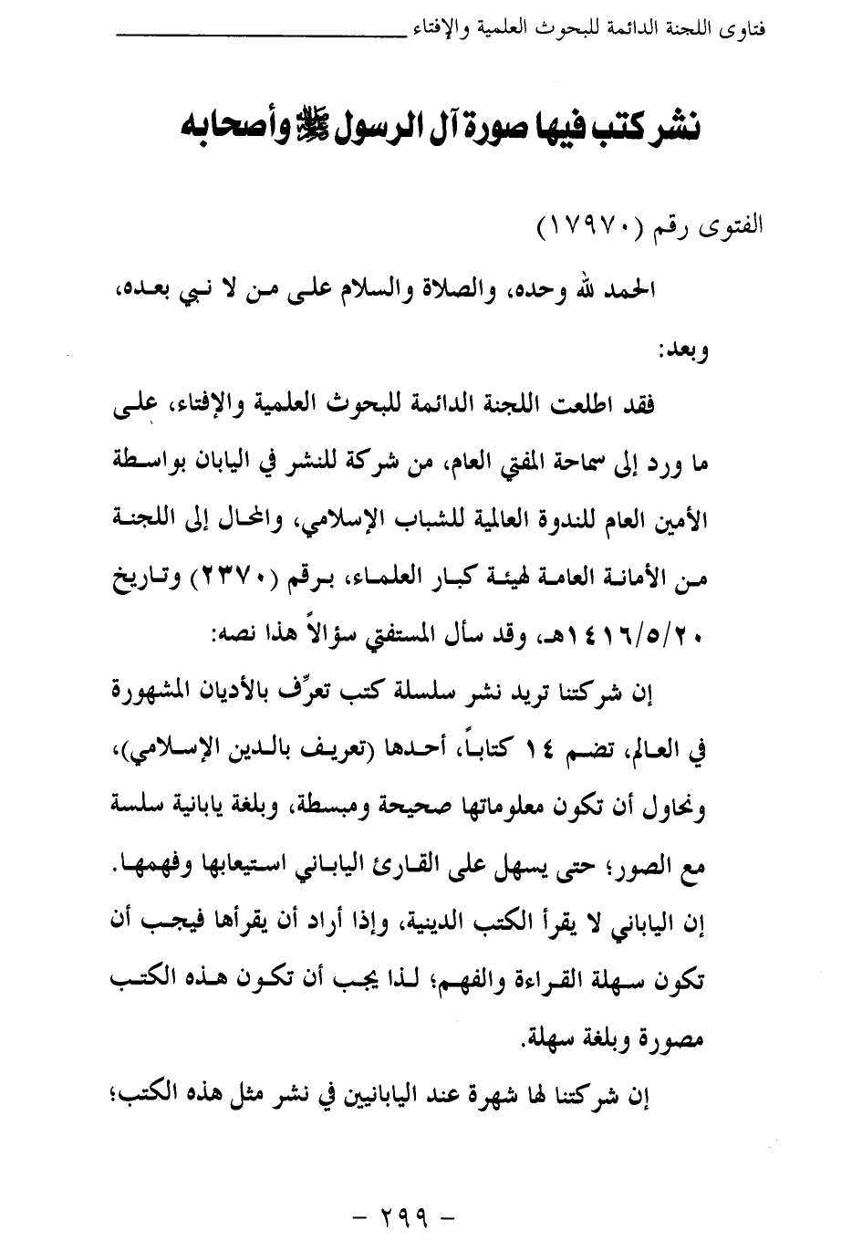 فقد اطلعت اللجنة الدائمة للبحوث العلمية والإفتاء، على ما ورد إلى سماحة المفتي العام، من شركة للنشر في اليابان بواسطة الأمين العام للندوة العالمية للشباب الإسلامي، والمحال إلى اللجنة من الأمانة العامة لهيئة كبار العلماء، برقم (2370) وتاريخ 20\5\1416 هـ، وقد سأل المستفتي سؤالا هذا نصه: