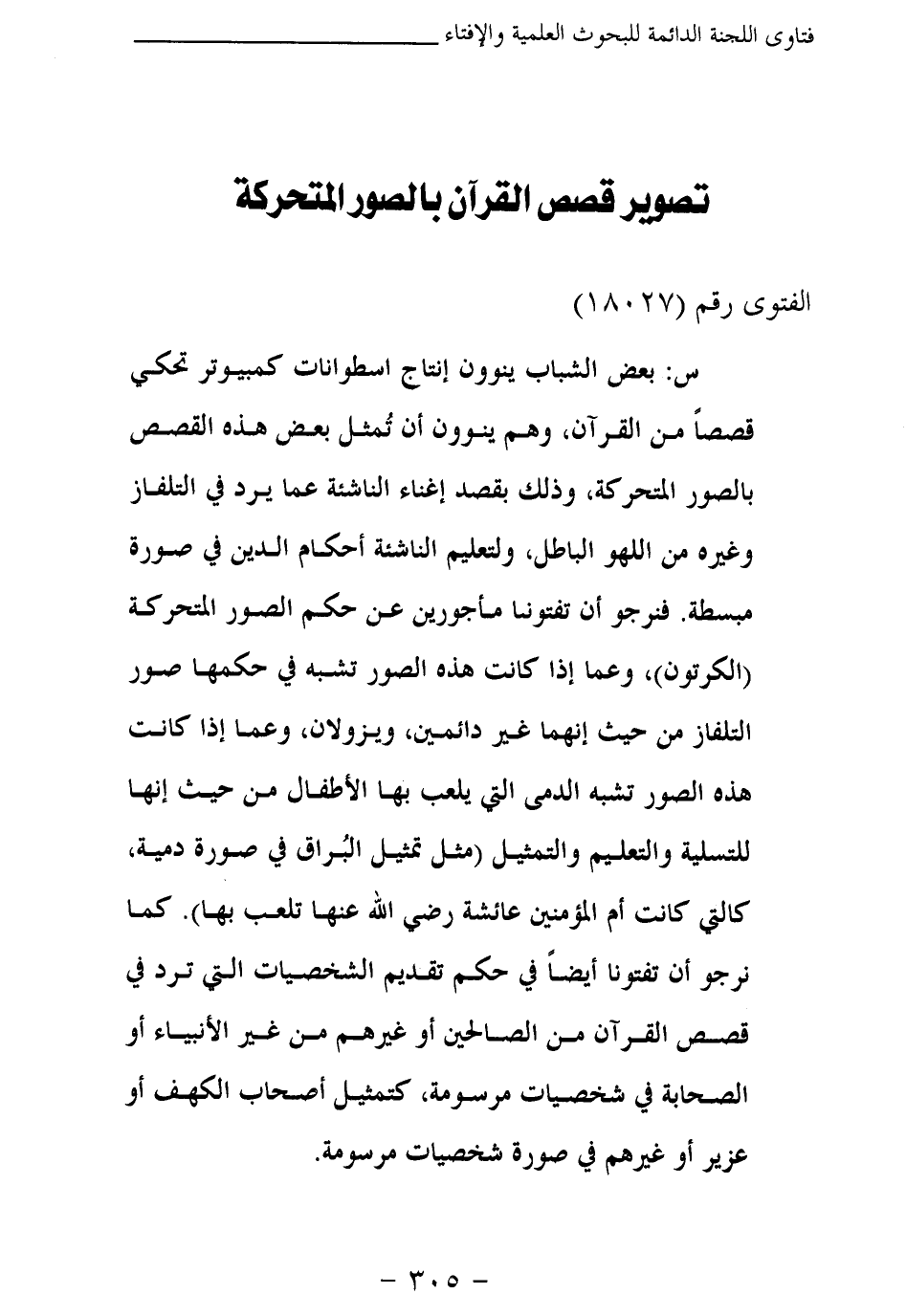 س: بعض الشباب ينوون إنتاج أسطوانات كمبيوتر تحكي قصصا من القرآن، وهم ينوون أن تمثل بعض هذه القصص بالصور المتحركة، وذلك، بقصد إغناء الناشئة عما يرد في التلفاز وغيره من اللهو الباطل، ولتعليم الناشئة أحكام الدين في صورة مبسطة. فنرجو أن تفتونا مأجورين عن حكم الصور المتحركة (الكرتون) ، وعما إذا كانت هذه الصور تشبه في حكمها صور التلفاز من حيث إنهما غير دائمين، ويزولان، وعما إذا كانت هذه الصور تشبه الدمى التي يلعب بها الأطفال من حيث إنها للتسلية والتعليم والتمثيل (مثل تمثيل البراق في صورة دمية، كالقط كانت أم المؤمنين عائشة - رضي الله عنها - تلعب بها) . كما نرجو أن تفتونا أيضا في حكم تقديم الشخصيات التي ترد في قصص القرآن من الصالحين، أو غيرهم من غير الأنبياء، أو الصحابة في شخصيات مرسومة، كتمثيل أصحاب الكهف أو عزير أو غيرهم في صورة شخصيات مرسومة.