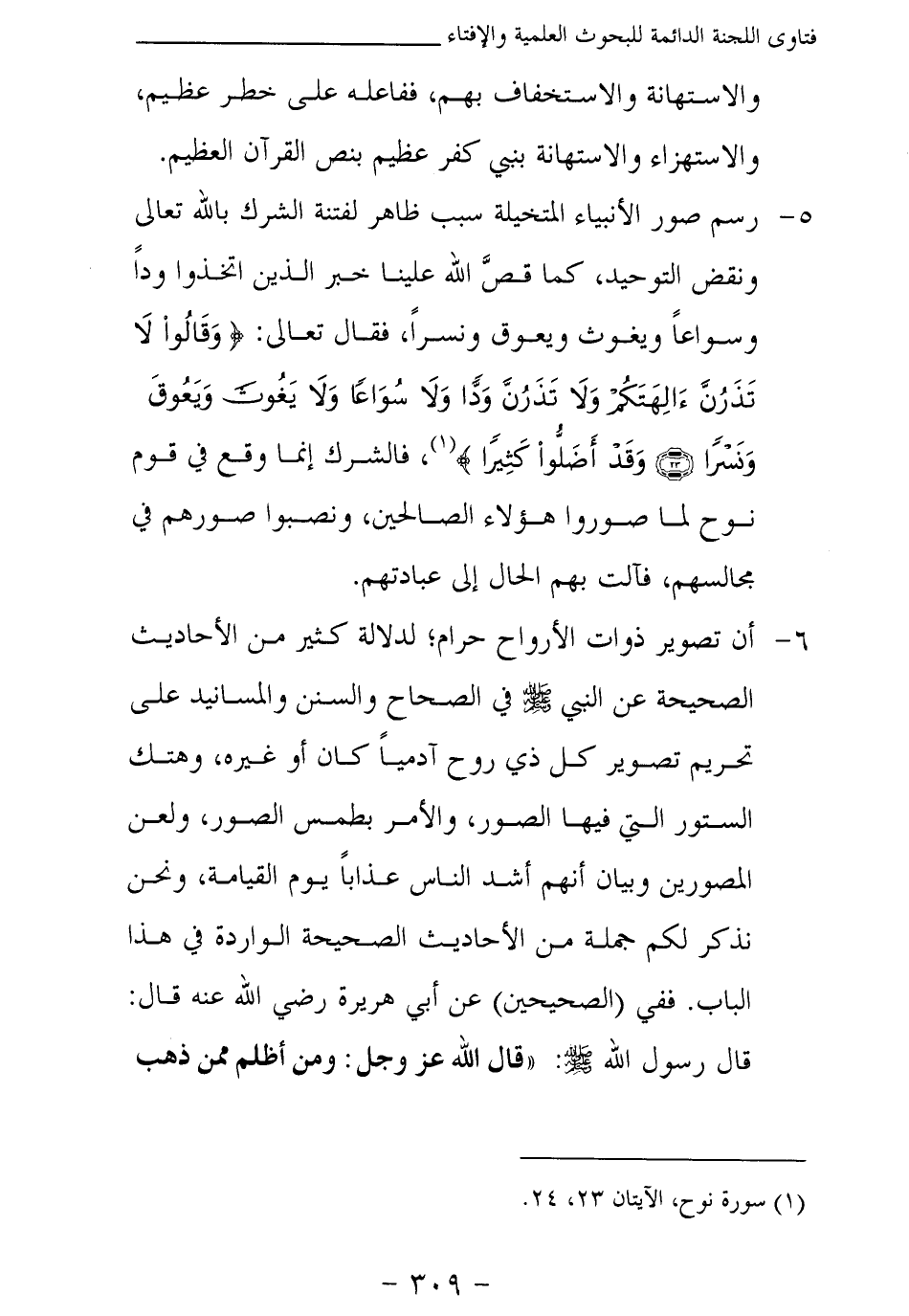 5- رسم صور الأنبياء المتخيلة سبب ظاهر لفتنة الشرك بالله تعالى ونقض التوحيد، كما قص الله علينا خبر الذين اتخذوا ودا وسواعا ويغوث ويعوق ونسرا، فقال تعالى: {وَقَالُوا لَا تَذَرُنَّ آلِهَتَكُمْ وَلَا تَذَرُنَّ وَدًّا وَلَا سُوَاعًا} (¬1) {وَلَا يَغُوثَ وَيَعُوقَ وَنَسْرًا} (¬2) {وَقَدْ أَضَلُّوا كَثِيرًا} (¬3) ، فالشرك إنما وقع في قوم نوح لما صوروا هؤلاء الصالحين، ونصبوا صورهم في مجالسهم، فآلت بهم الحال إلى عبادتهم.
