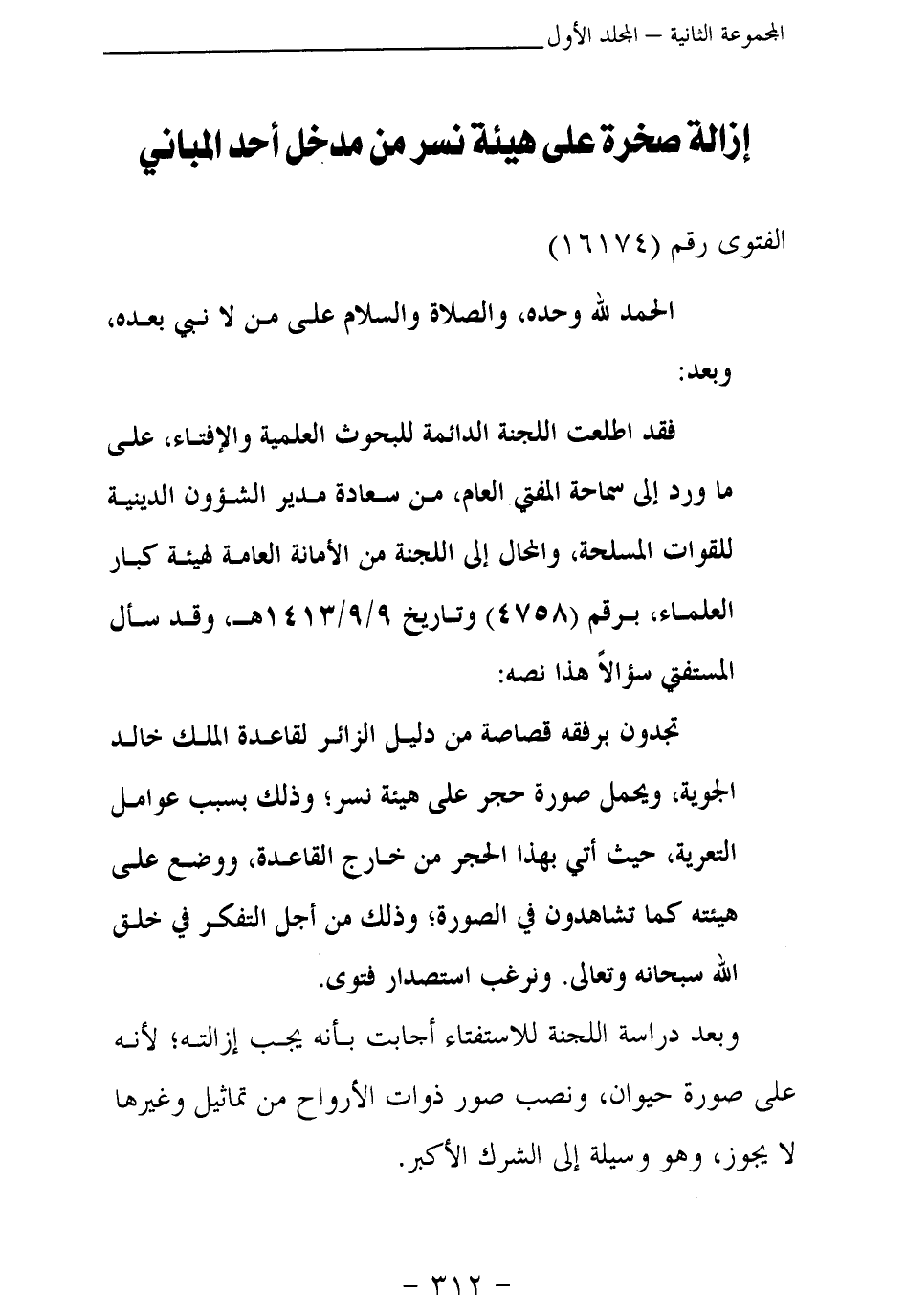 وبعد دراسة اللجنة للاستفتاء أجابت بأنه يجب إزالته؛ لأنه على صورة حيوان، ونصب صور ذوات الأرواح من تماثيل وغيرها لا يجوز، وهو وسيلة إلى الشرك الأكبر.