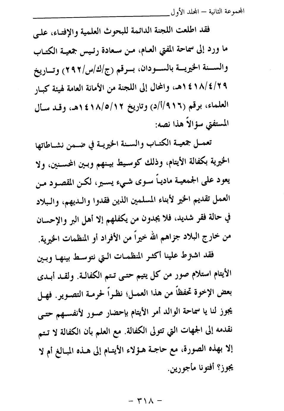 فقد اطلعت اللجنة الدائمة للبحوث العلمية والإفتاء، على ما ورد إلى سماحة المفتي العام، من سعادة رئيس جمعية الكتاب والسنة الخيرية بالسودان، برقم (ج\ ك\ س\ 292) وتاريخ 29\4\1418 هـ، والمحال إلى اللجنة من الأمانة العامة لهيئة كبار العلماء، برقم (916\أ\د) وتاريخ 12\5\1418 هـ، وقد سأل المستفتي سؤالا هذا نصه: