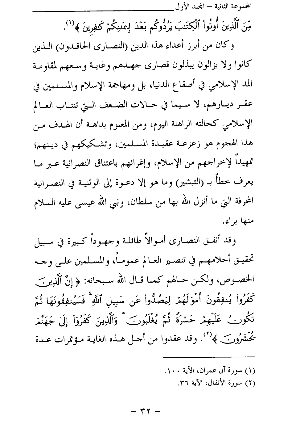 وكان من أبرز أعداء هذا الدين (النصارى الحاقدون) الذين كانوا ولا يزالون يبذلون قصارى جهدهم وغاية وسعهم لمقاومة المد الإسلامي في أصقاع الدنيا، بل ومهاجمة الإسلام والمسلمين في عقر ديارهم، لا سيما في حالات الضعف التي تنتاب العالم الإسلامي كحالته الراهنة اليوم، ومن المعلوم بداهة أن الهدف من هذا الهجوم هو زعزعة عقيدة المسلمين، وتشكيكهم في دينهم؛ تمهيدا لإخراجهم من الإسلام، وإغرائهم باعتناق النصرانية عبر ما يعرف خطأ بـ (التبشير) وما هو إلا دعوة إلى الوثنية في النصرانية المحرفة التي ما أنزل الله بها من سلطان، ونبي الله عيسى عليه السلام منها براء.